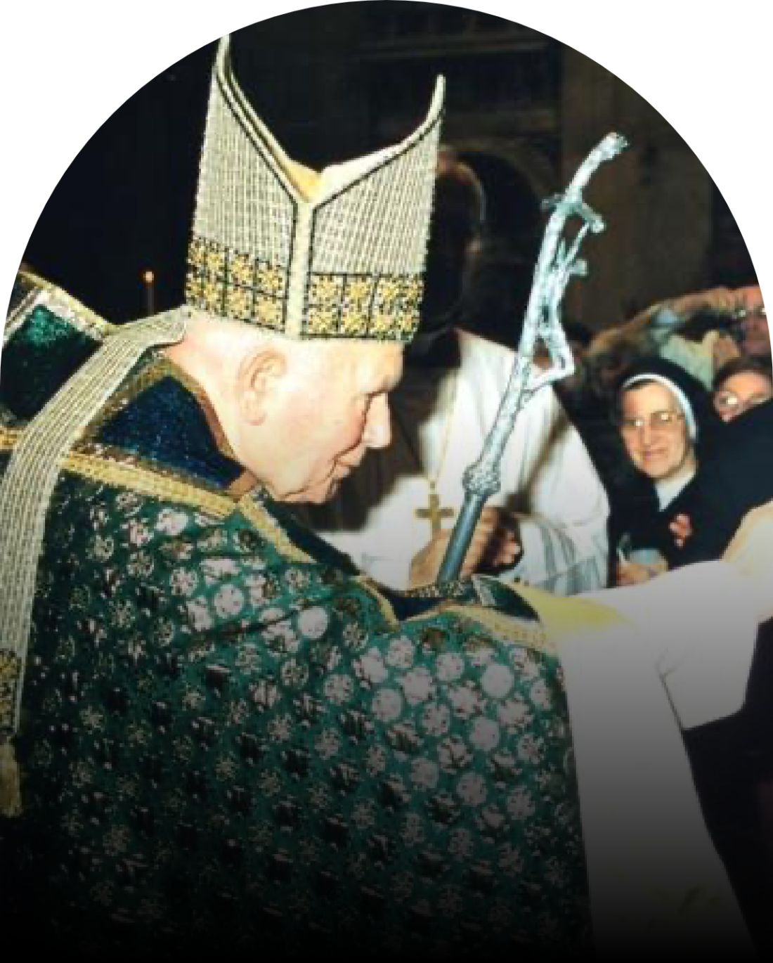 The Chasuble was commissioned by the Office of Liturgical Celebrations of the Supreme Pontiff and donated by the Diocese of Rome to His Bishop. After the celebration of the double pontifical and episcopal jubilee, the Holy Father arranged for the vestment to be destined for His Cathedral, the Lateran Archbasilica. In anticipation of liturgical use in St. John's, the anchoring fimbules were added, the jeweled aurifrey was made for the neck, and two gilded silver epigraphs were placed on the verso of the stole to commemorate the Event.