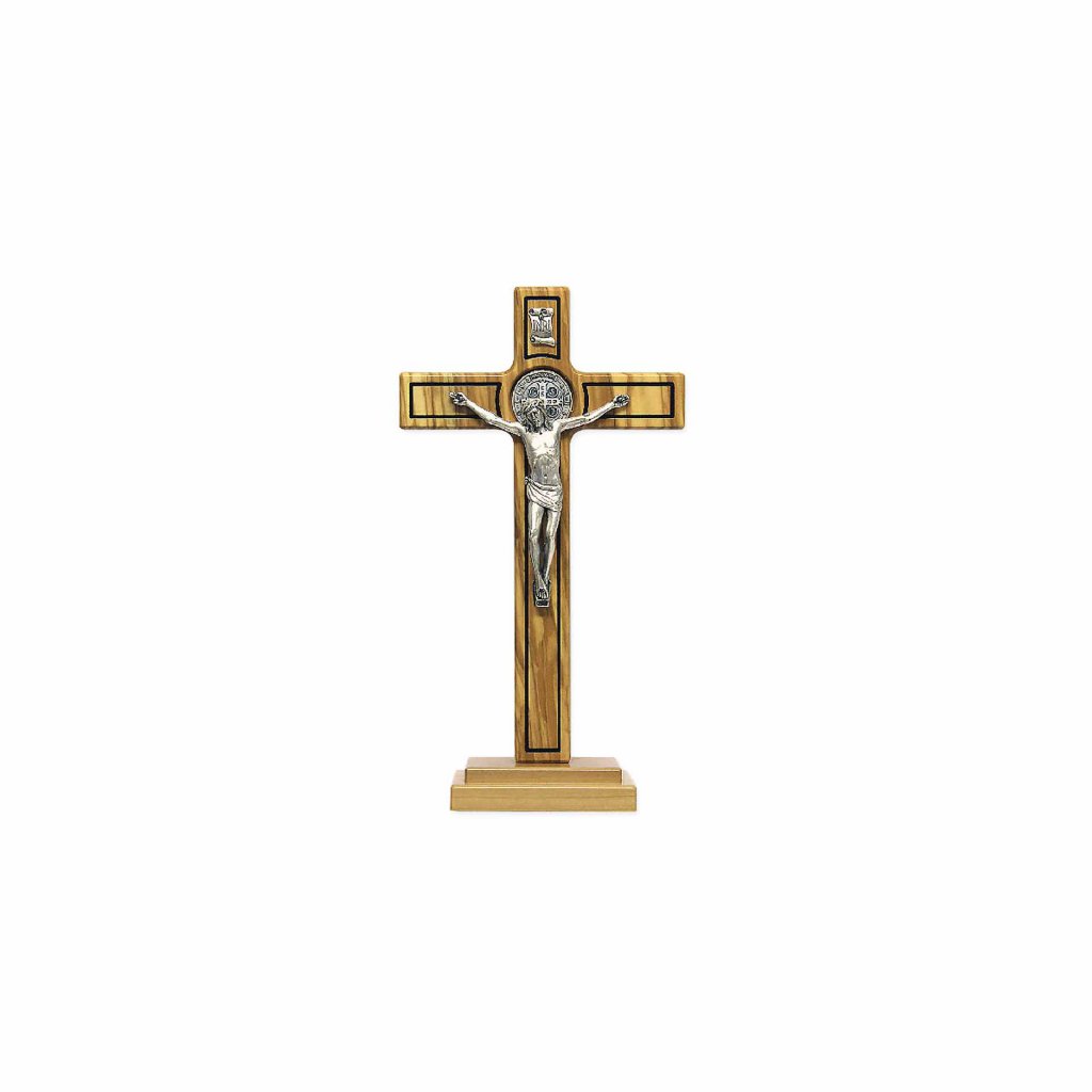Freestanding crucifix of Saint Benedict in fine olive wood, with body and medal of the saint in silver-plated metal, finely crafted and with attention to detail.