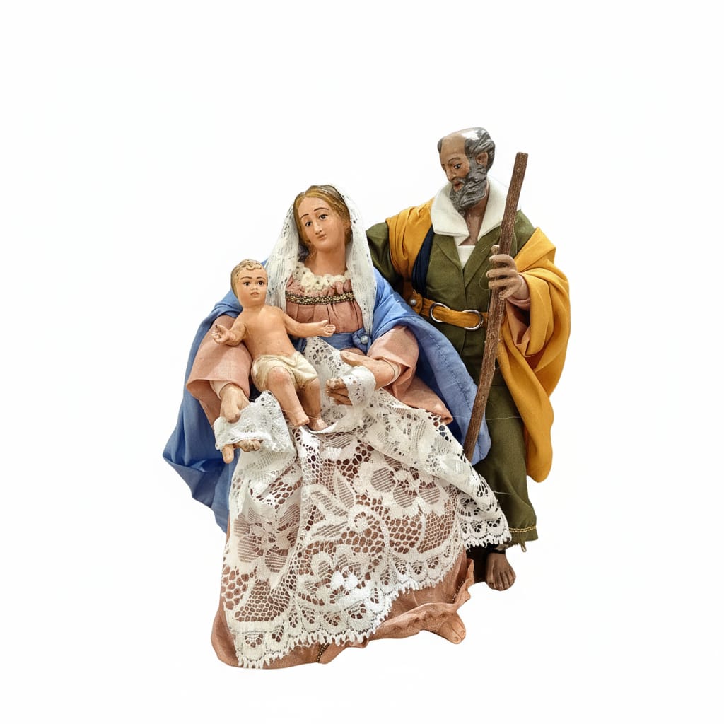 The hand-painted ceramic and fabric nativity scene characters are 17 cm tall