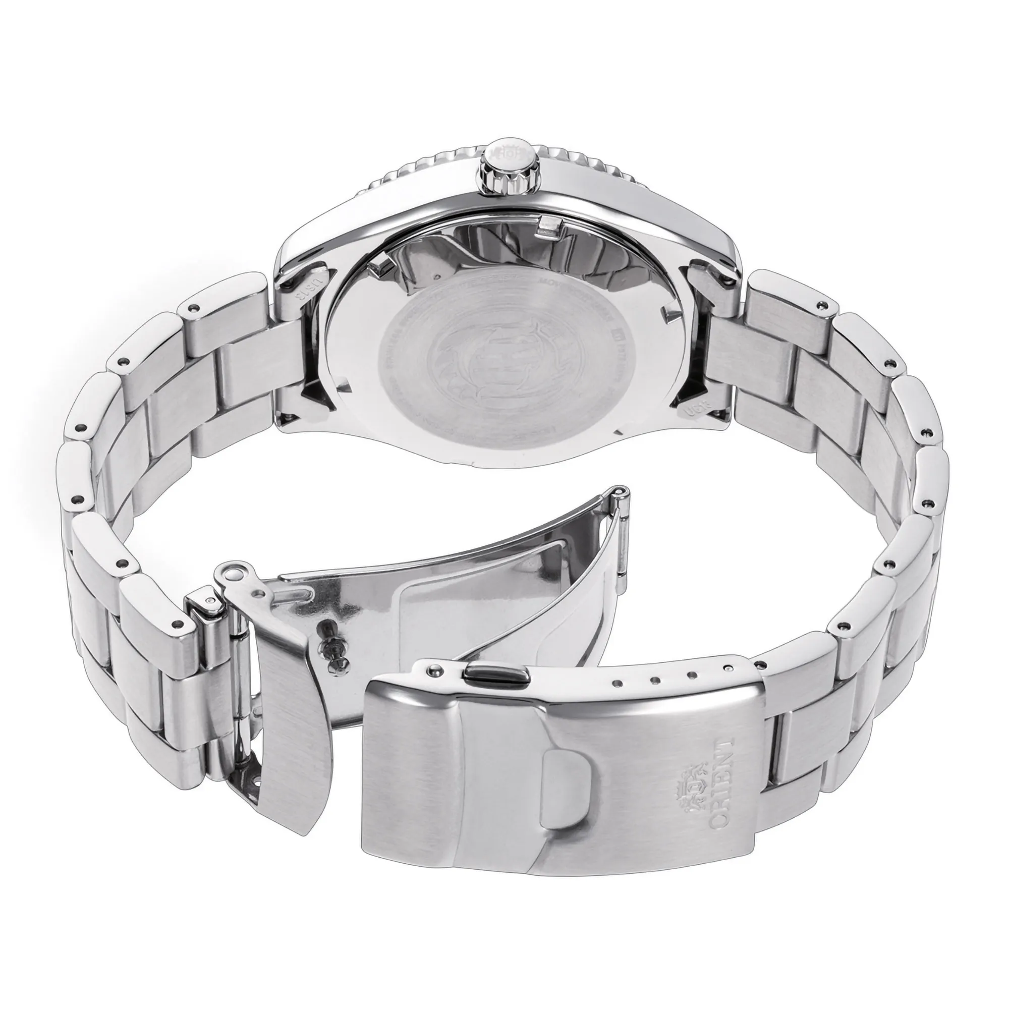 The Diver Mako 40mm, a new ORIENT SPORT timepiece with a marine feel, features a lightweight design and essential style. The 40mm case and 20mm bracelet are suitable for both men and women's wrists. The absence of crown guards and the steel bezel emphasize the minimalist feel, as do the luminescent hands and indexes, legible even in the dark, creating a cleaner, simpler, and more visible dial layout. The white dial is lively and casual. The customary Japanese reliability is evident in the caliber and water resistance.
