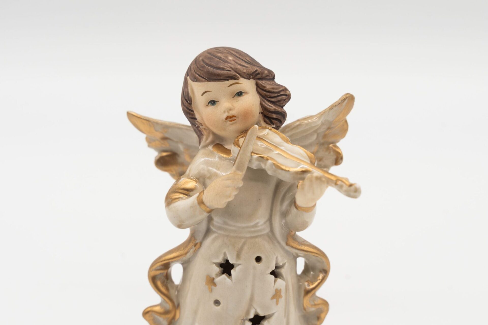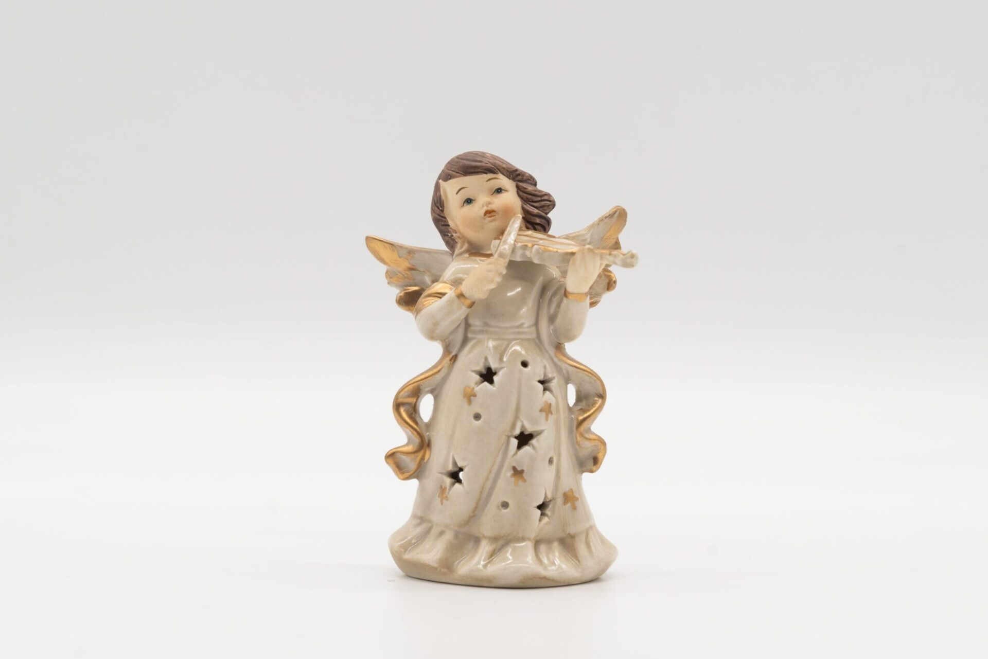 L’angelo tiene un piccolo violino tra le mani, con l’archetto sollevato come se stesse per iniziare a suonare una dolce melodia.