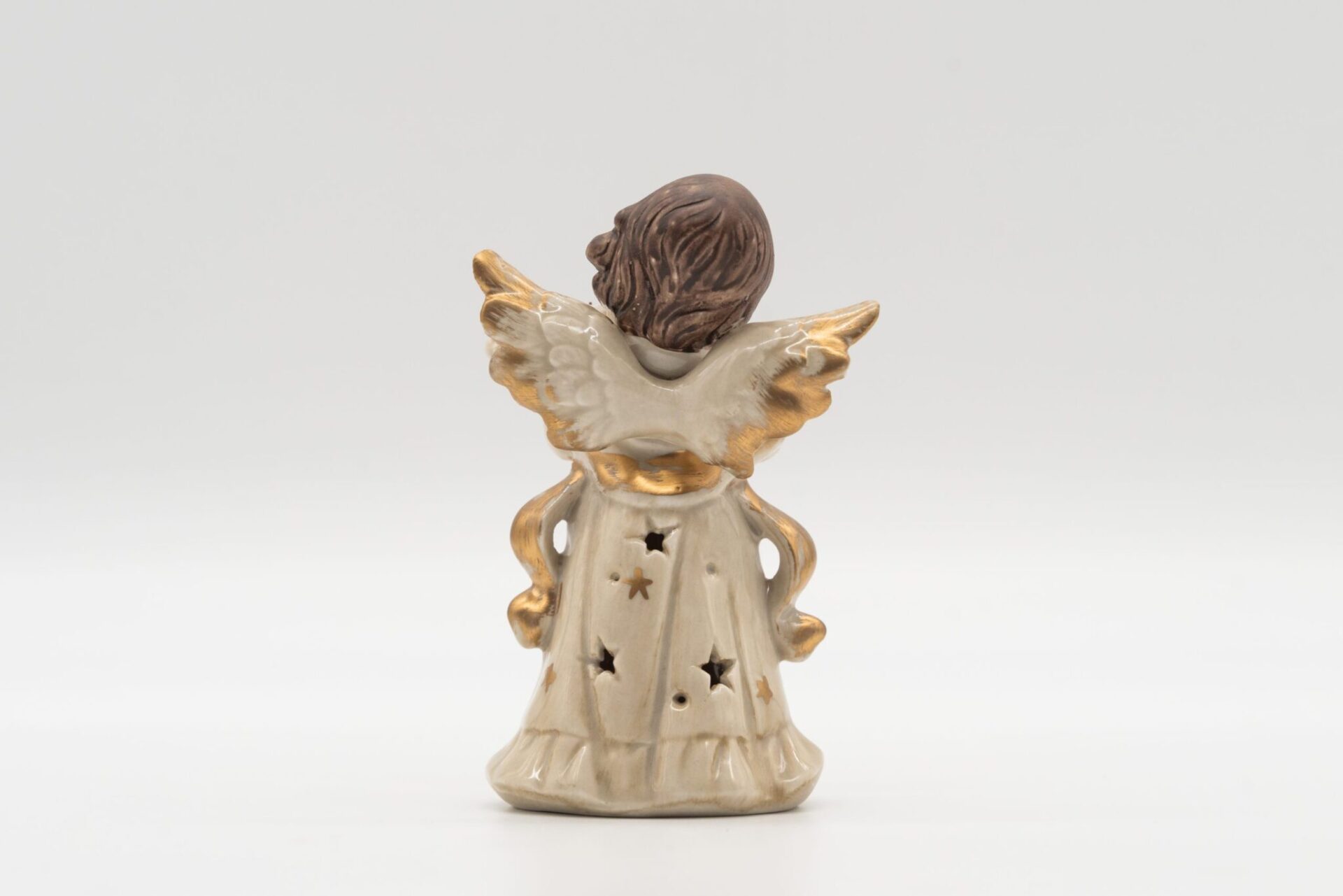 L’angelo in ceramica è vestito con una tunica fluente che sembra quasi muoversi con la brezza.