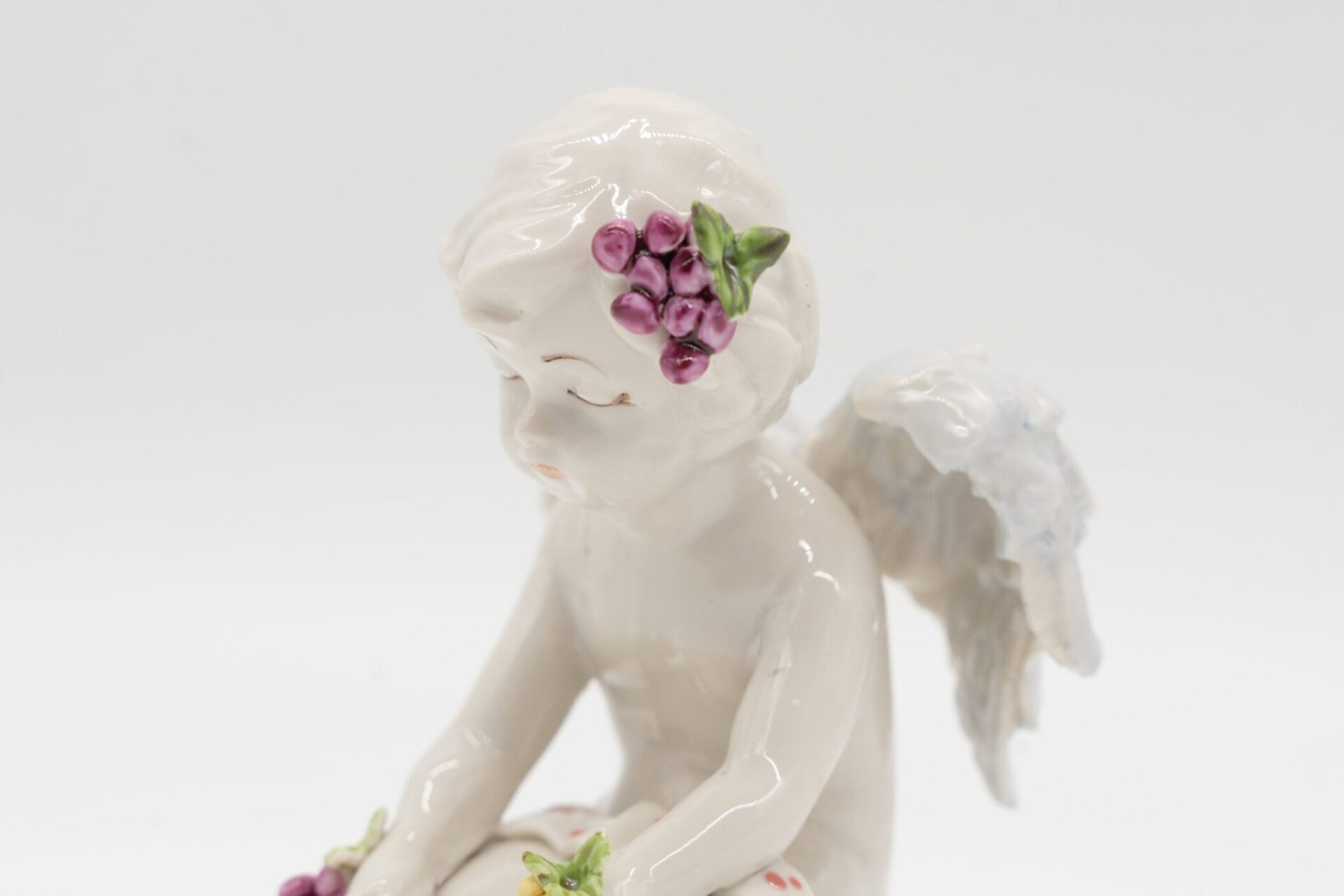 Sulla testa dell’angelo c’è una decorazione floreale che include grappoli d’uva viola e foglie verdi.