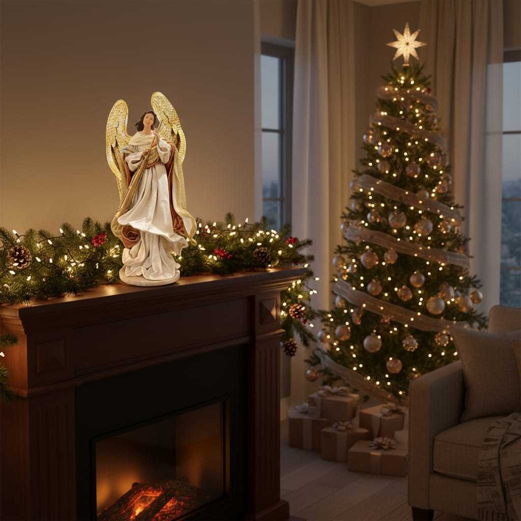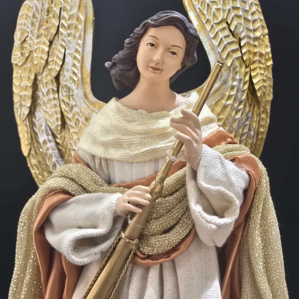 Angelo decorativo in posizione maestosa, con ali dorate finemente lavorate e veste fluente color crema con dettagli oro e bronzo. Tiene in mano una lunga tromba, simbolo di annuncio celeste. Il volto sereno e l’espressione dolce trasmettono pace e spiritualità. Realizzato con materiali di alta qualità e cura artigianale, è ideale per ambienti sacri o decorazioni natalizie eleganti. Un pezzo che unisce arte, fede e bellezza.
