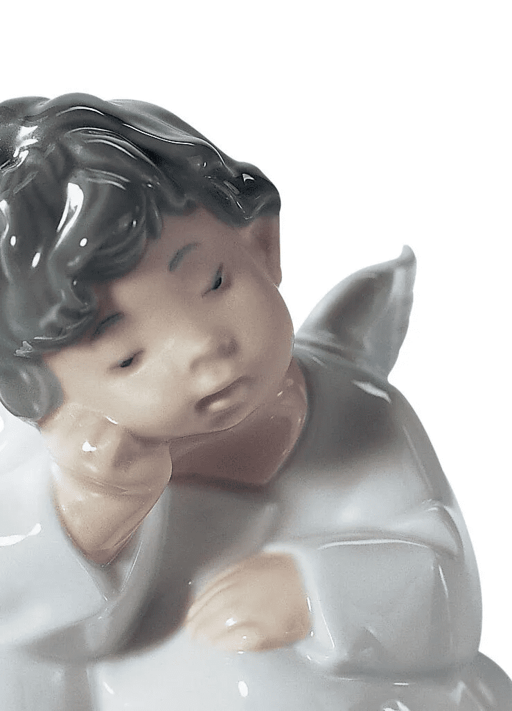 L’angelo ha un’espressione serena sul volto e sembra essere assorto in un momento di quiete e contemplazione.