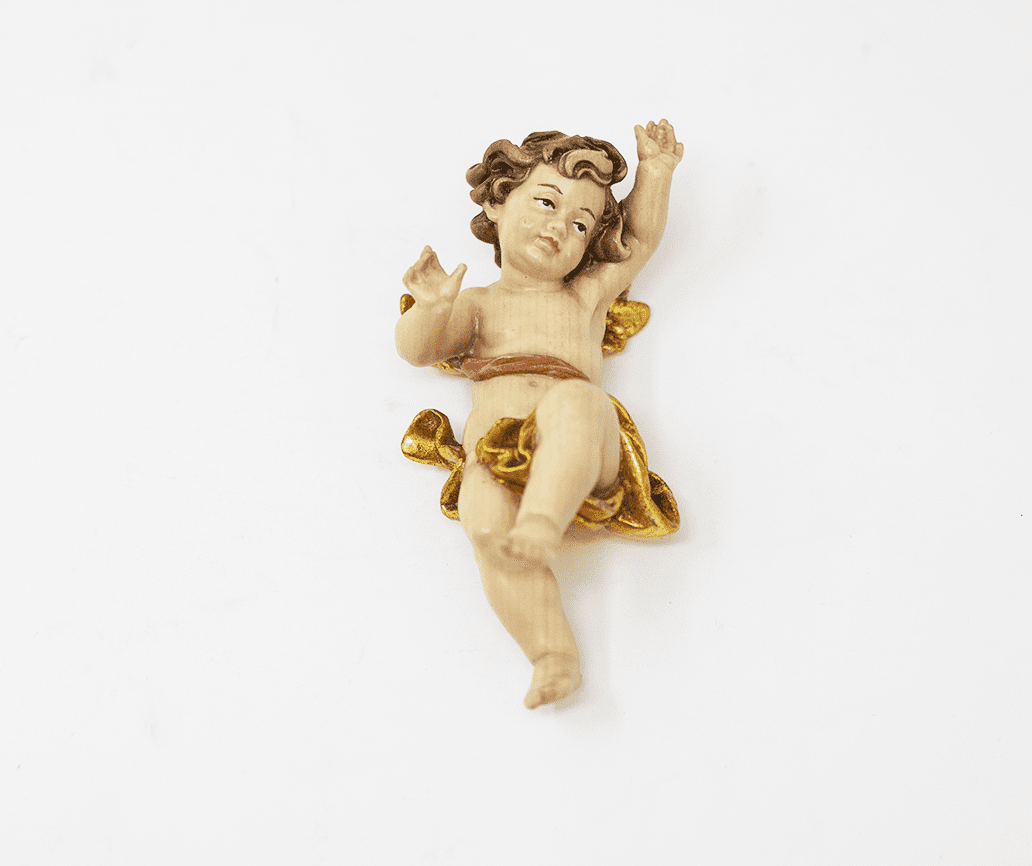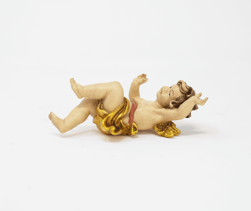 L’angelo è sdraiato su un fianco, con un braccio sollevato verso il viso e l’altro disteso.