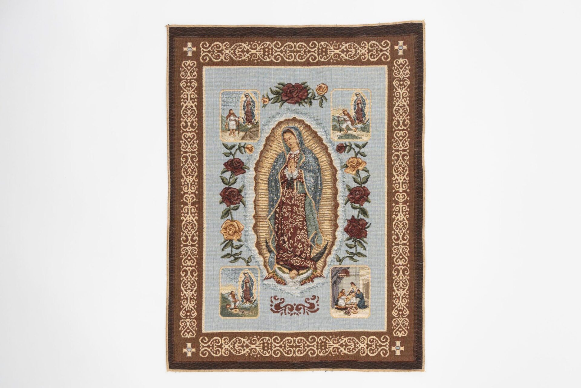 L’arazzo è incorniciato da un bordo ornamentale con motivi decorativi, un elemento tipico delle opere tessili religiose.