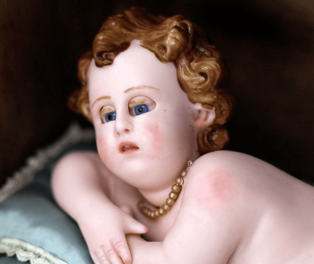 Il Gesù Bambino benedicente, interamente realizzato in cera, è un’opera straordinaria che unisce la complessità meccanica alla raffinata arte scultorea. Questo automa unico muove il capo, apre gli occhi e solleva il braccio per impartire la sua benedizione, grazie all’attivazione a corda del carillon.