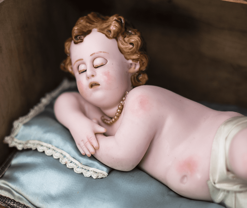 Il Bambinello è rappresentato su un fianco, nudo e avvolto in un panno di seta bianca.