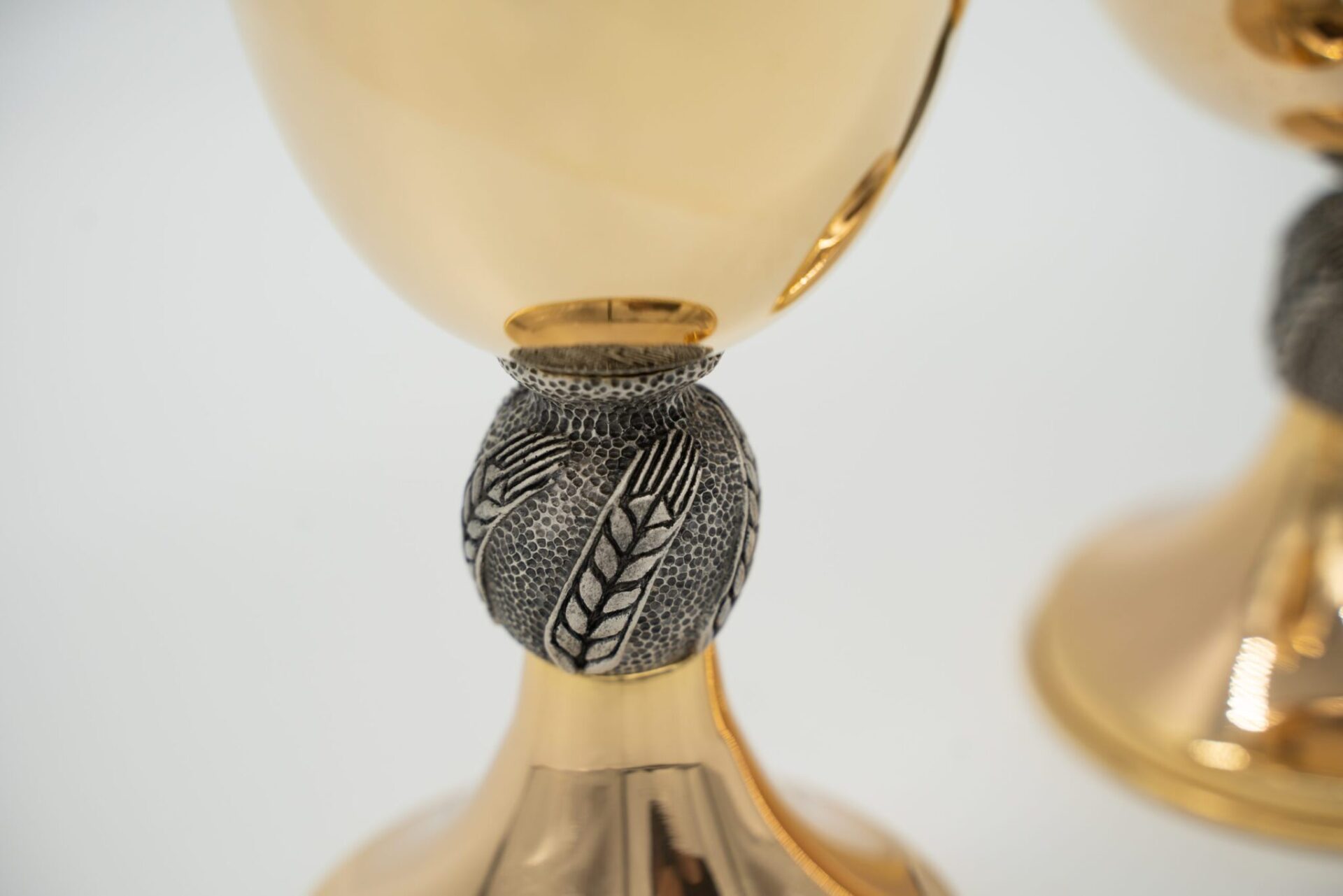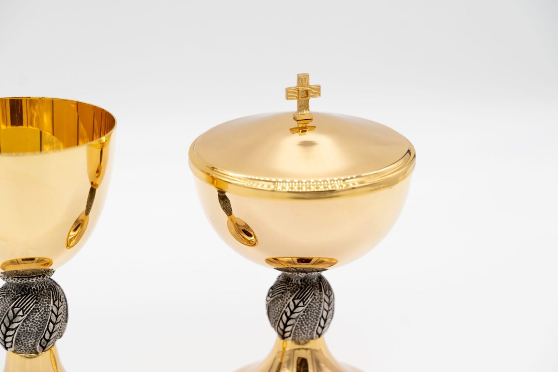 Completo calice e pisside in metallo dorato a spessore, con nodo artistico.