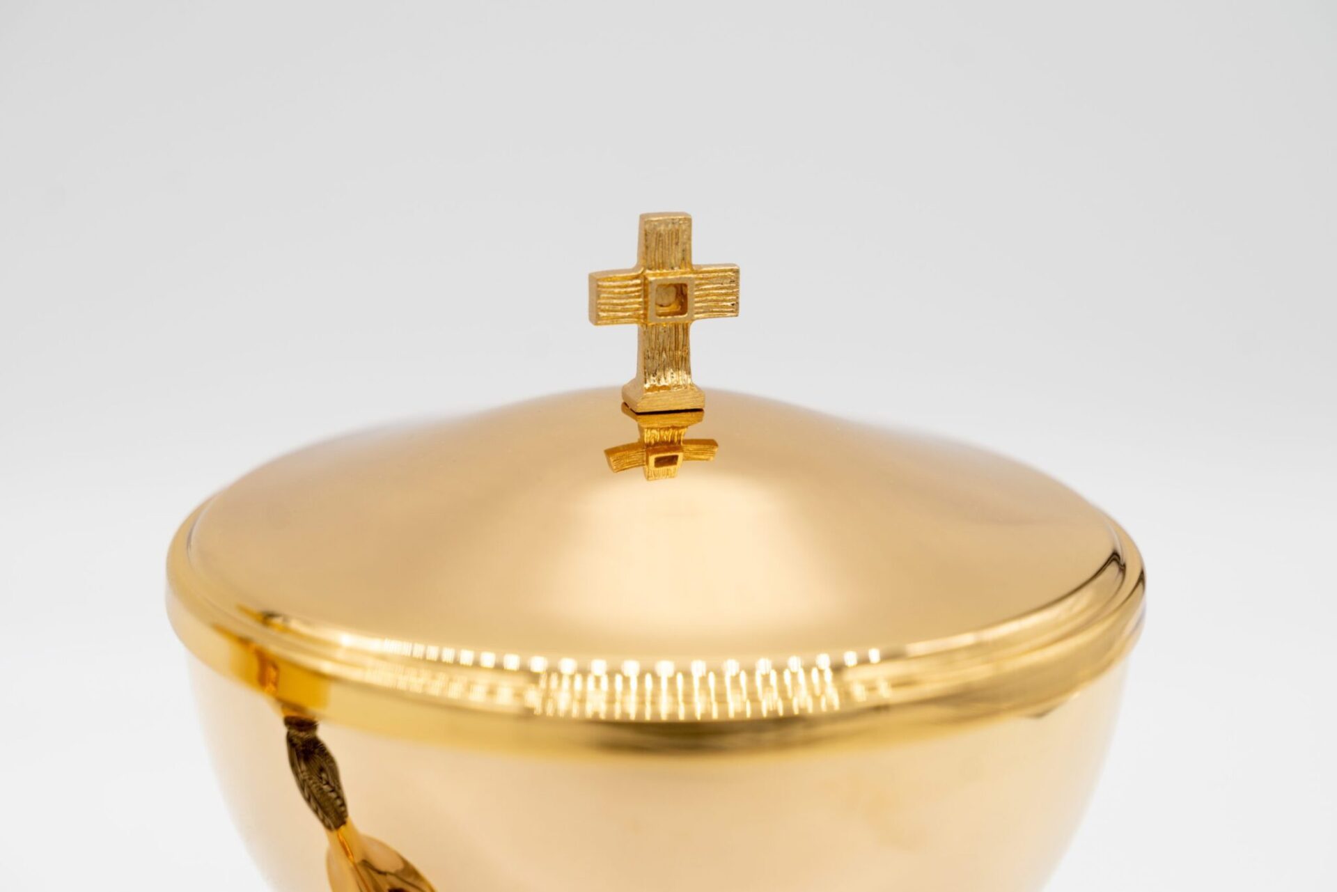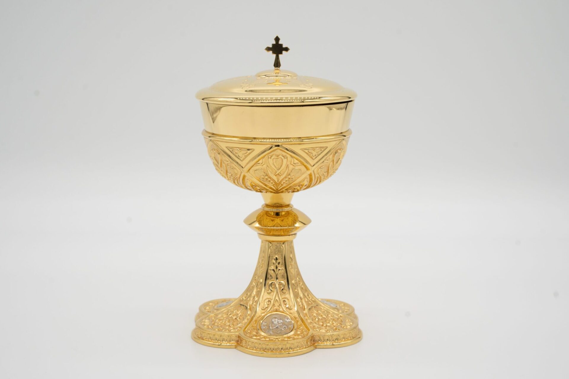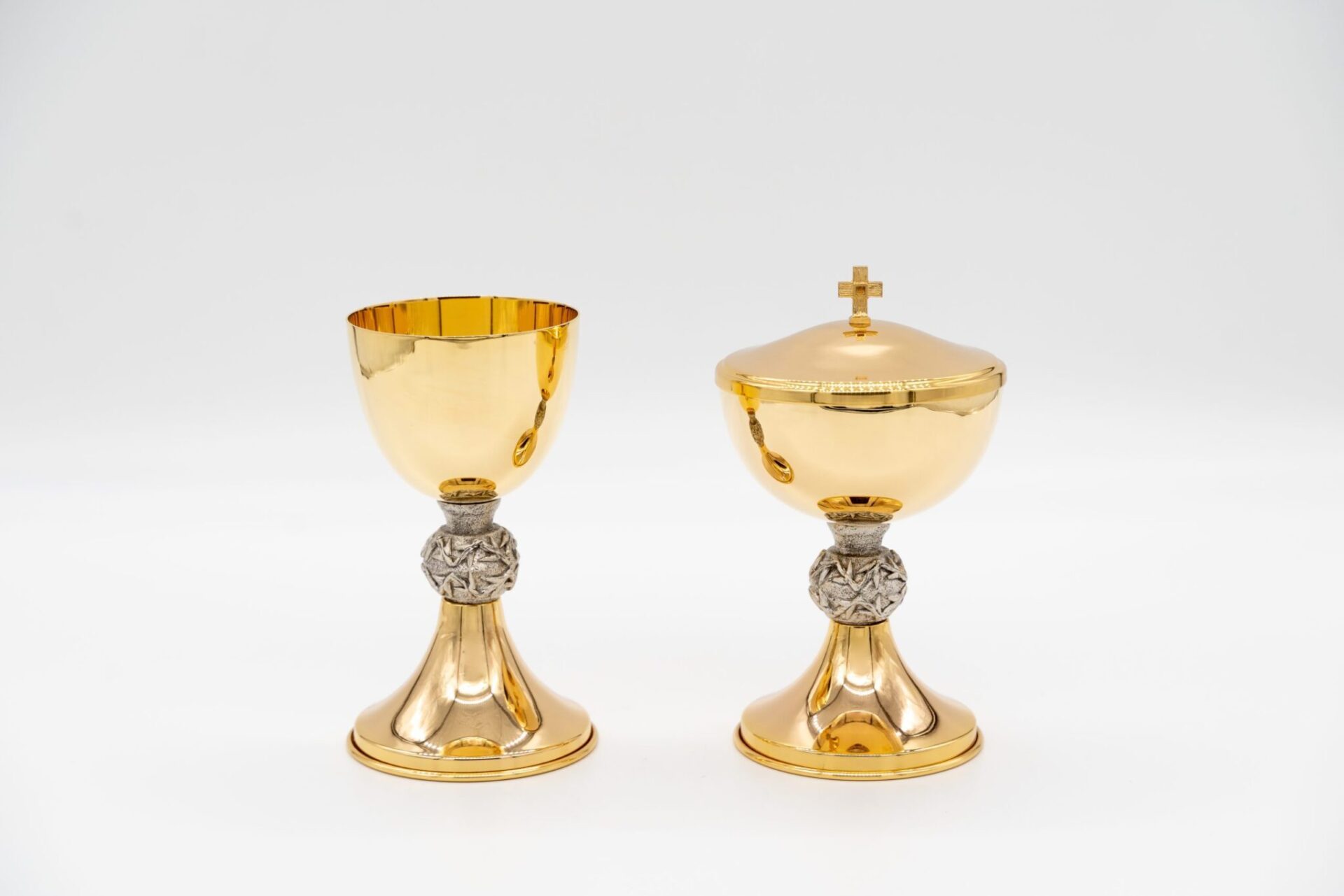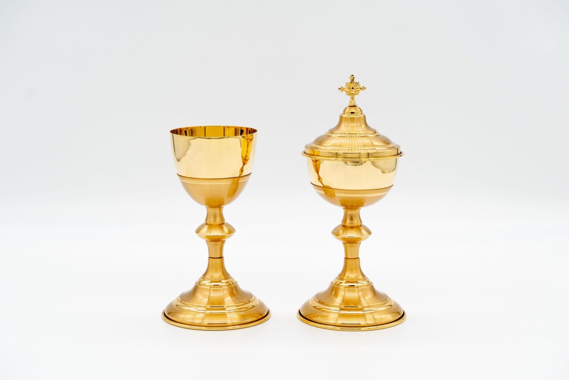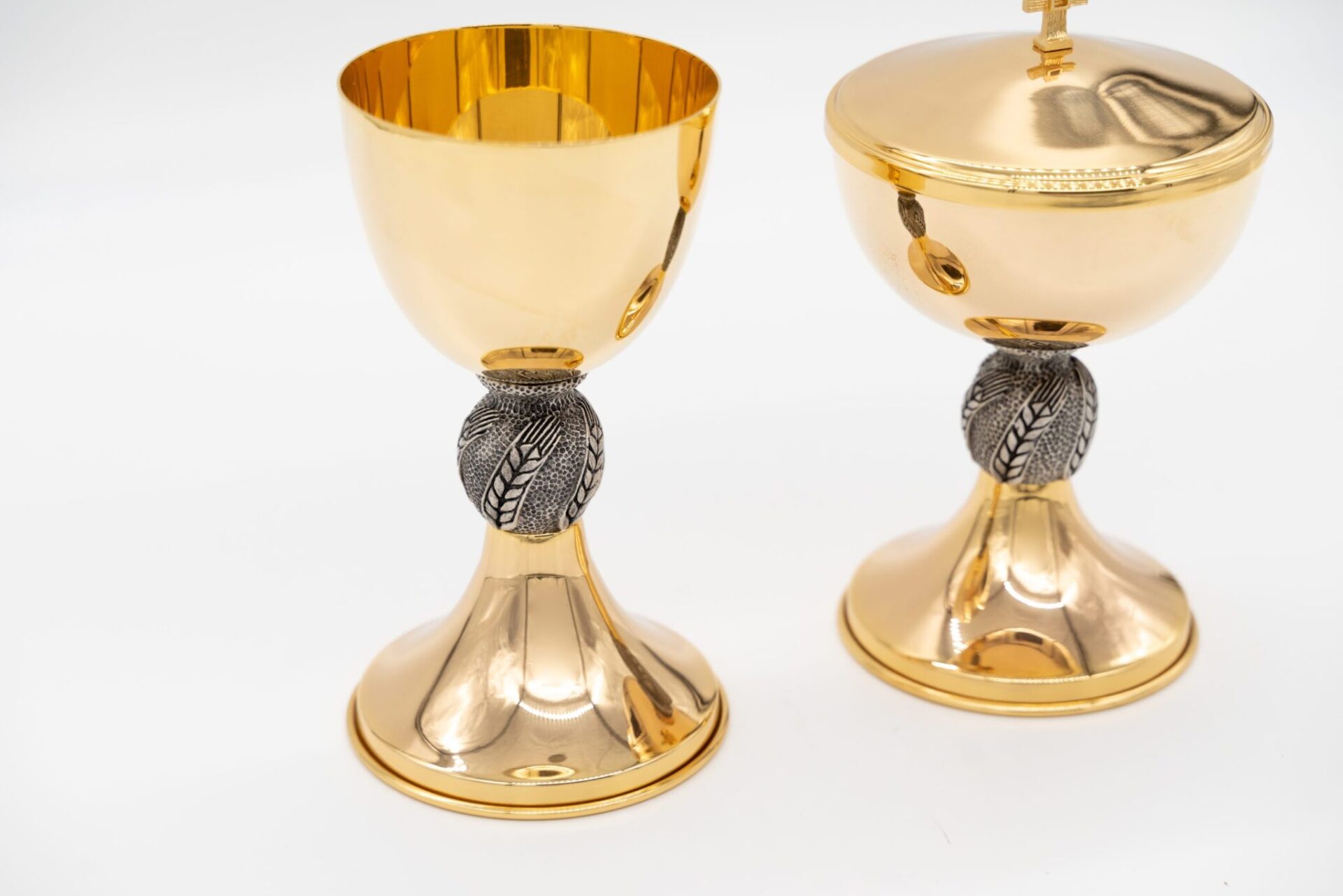 Il calice e la pisside sono progettati per essere proporzionati e funzionali, con una base larga e stabile, un gambo sottile e una coppa ampia.