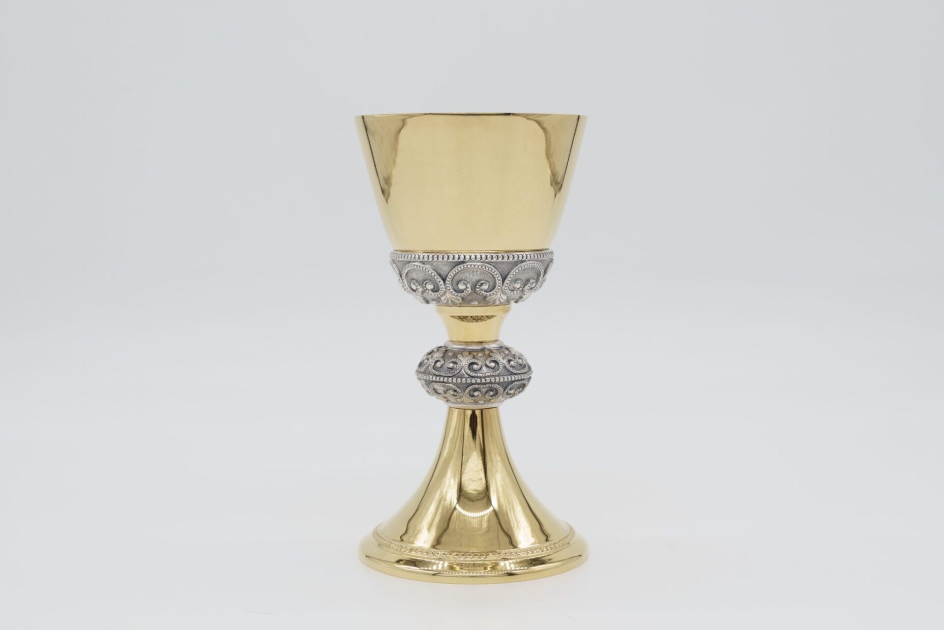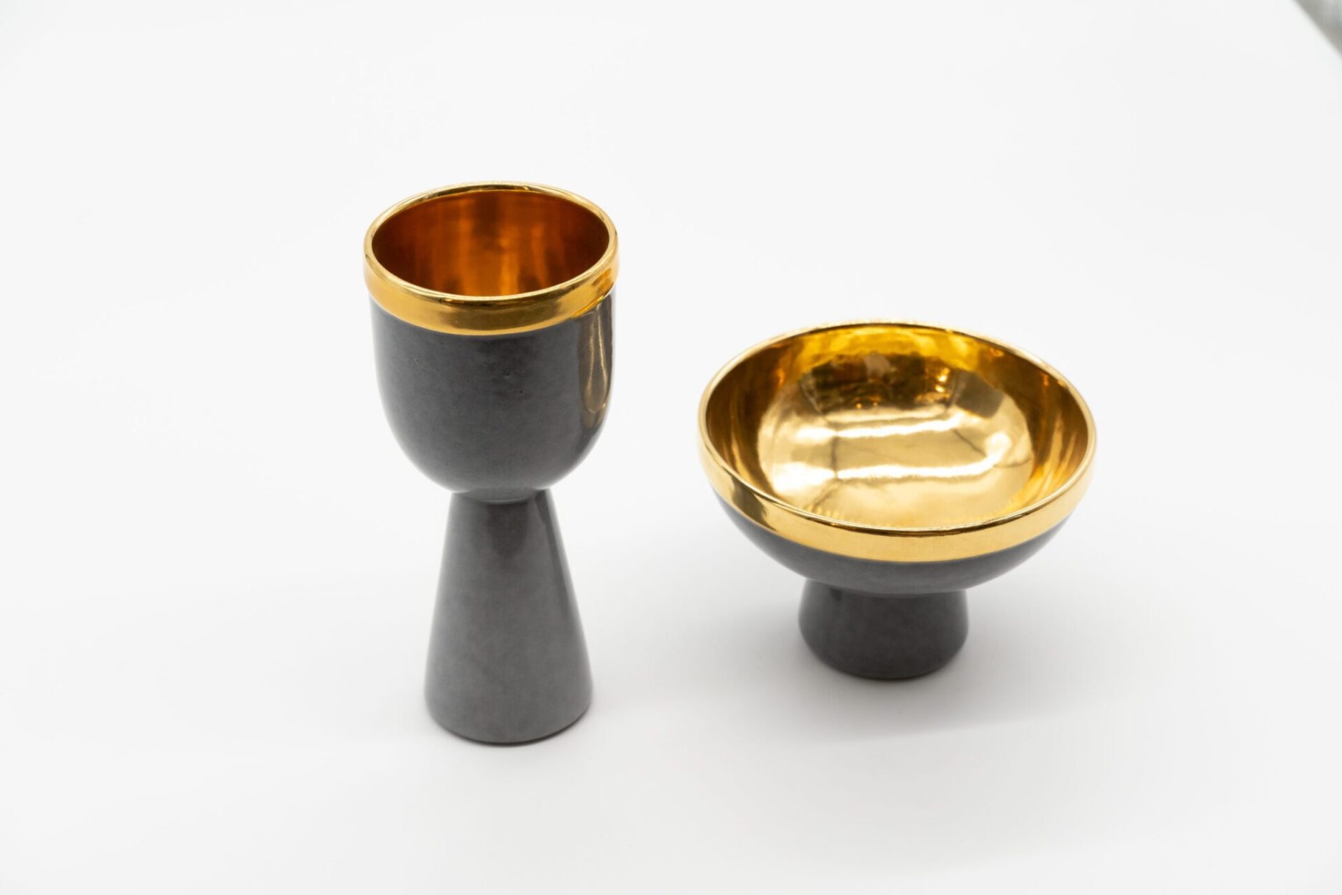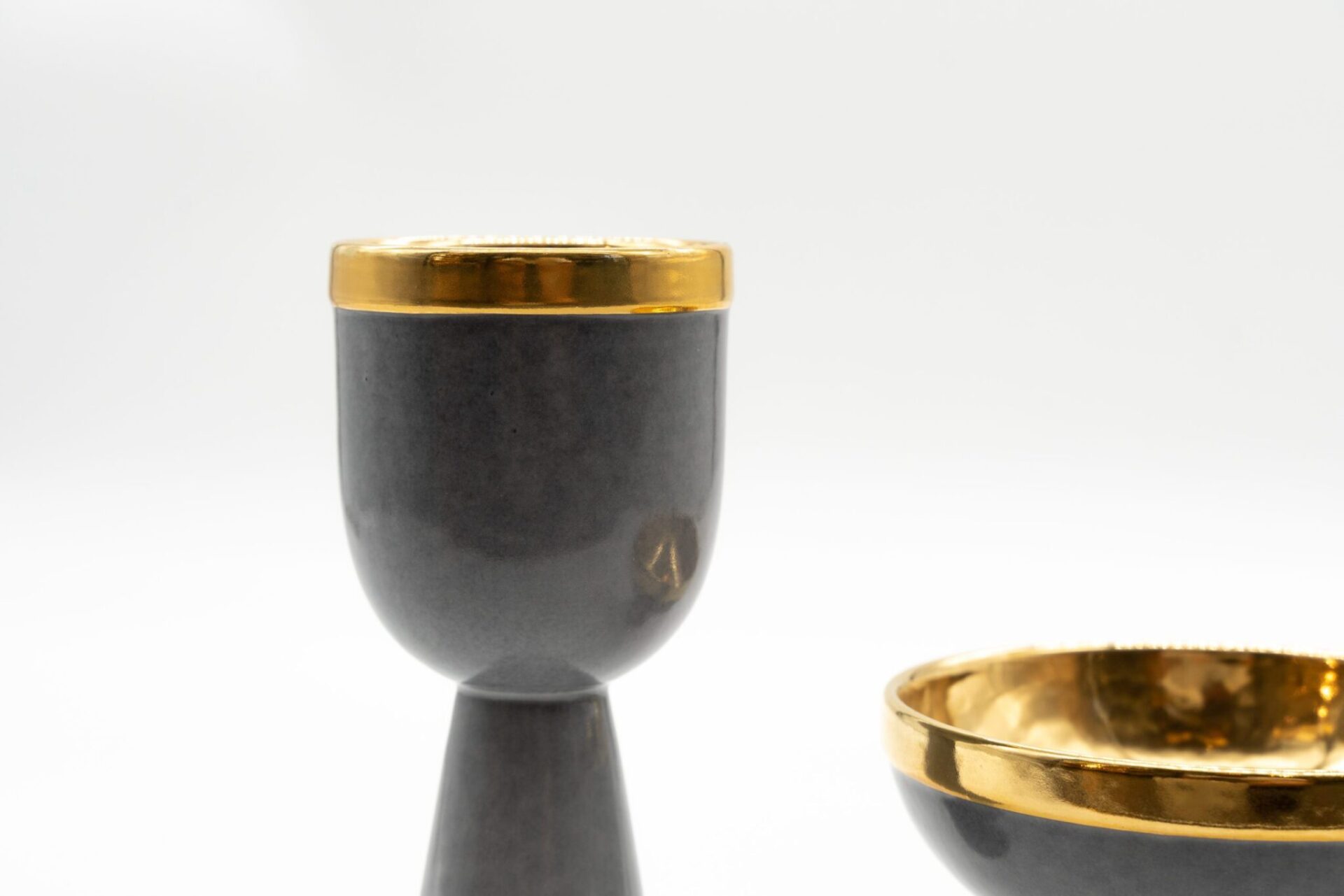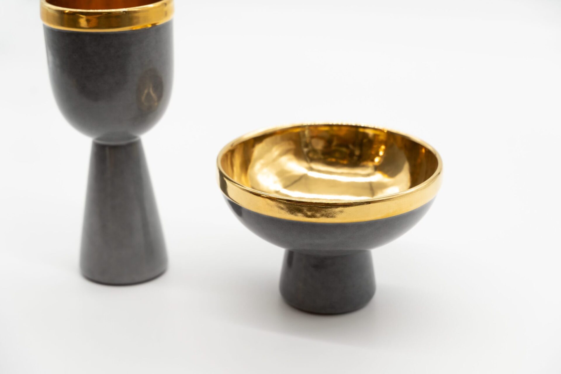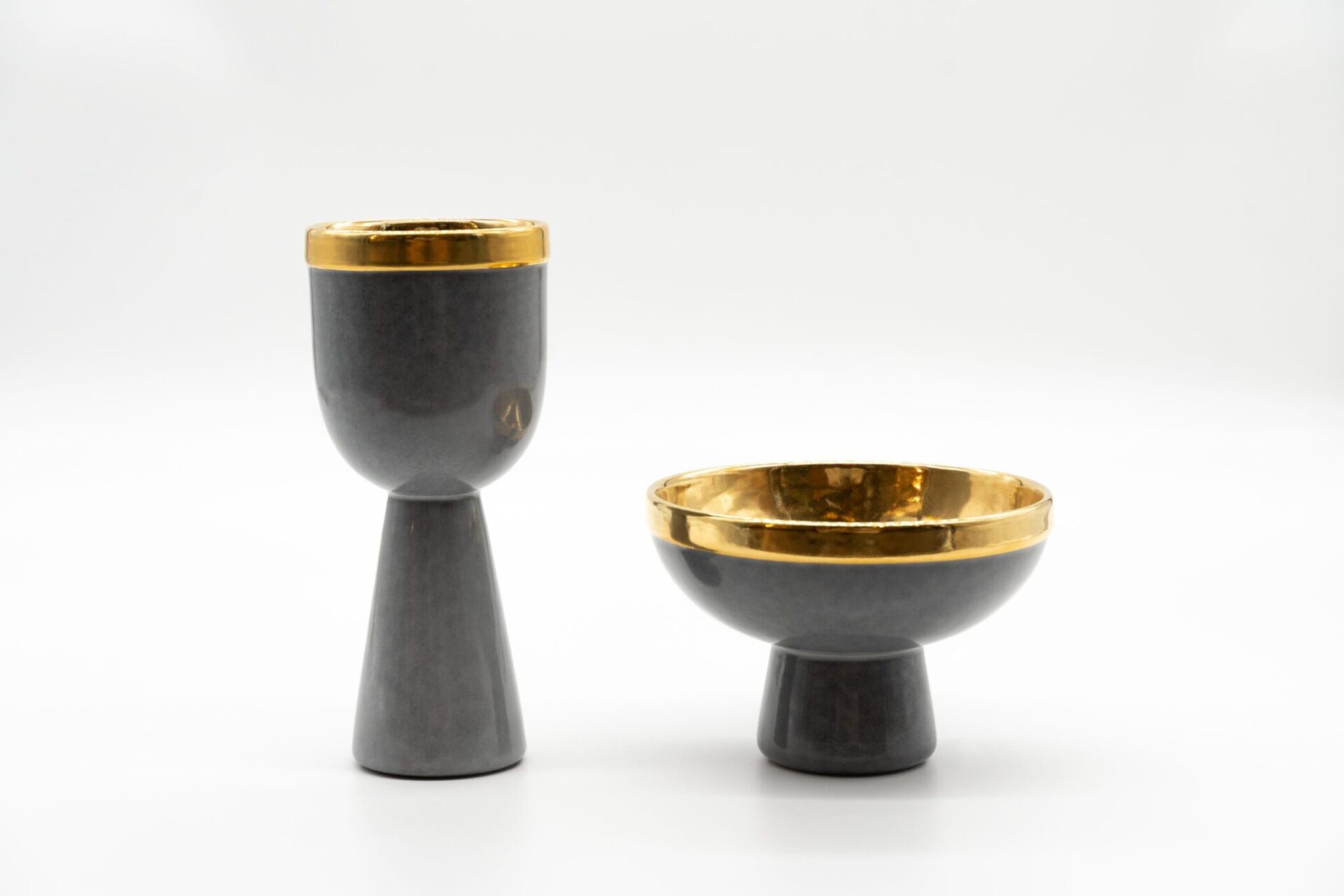 Set di calice e ciotola in gres, realizzato con le materie prime più pregiate, tra cui il caolino. Questo set, rifinito in oro, incarna l’eleganza materica della porcellana e la semplicità della ceramica.