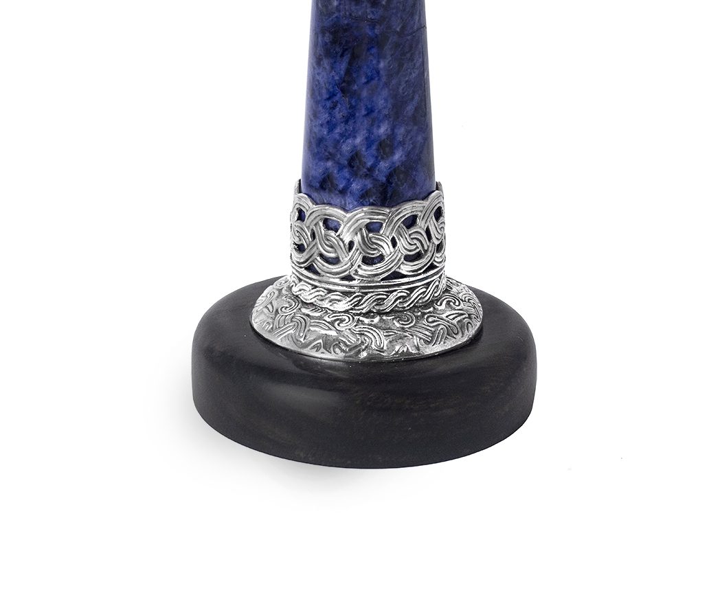 Il corpo è realizzato in sodalite blu e legato ad una base di ebano da una fascia in argento con decorazioni in stile.