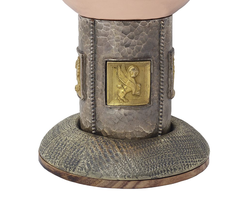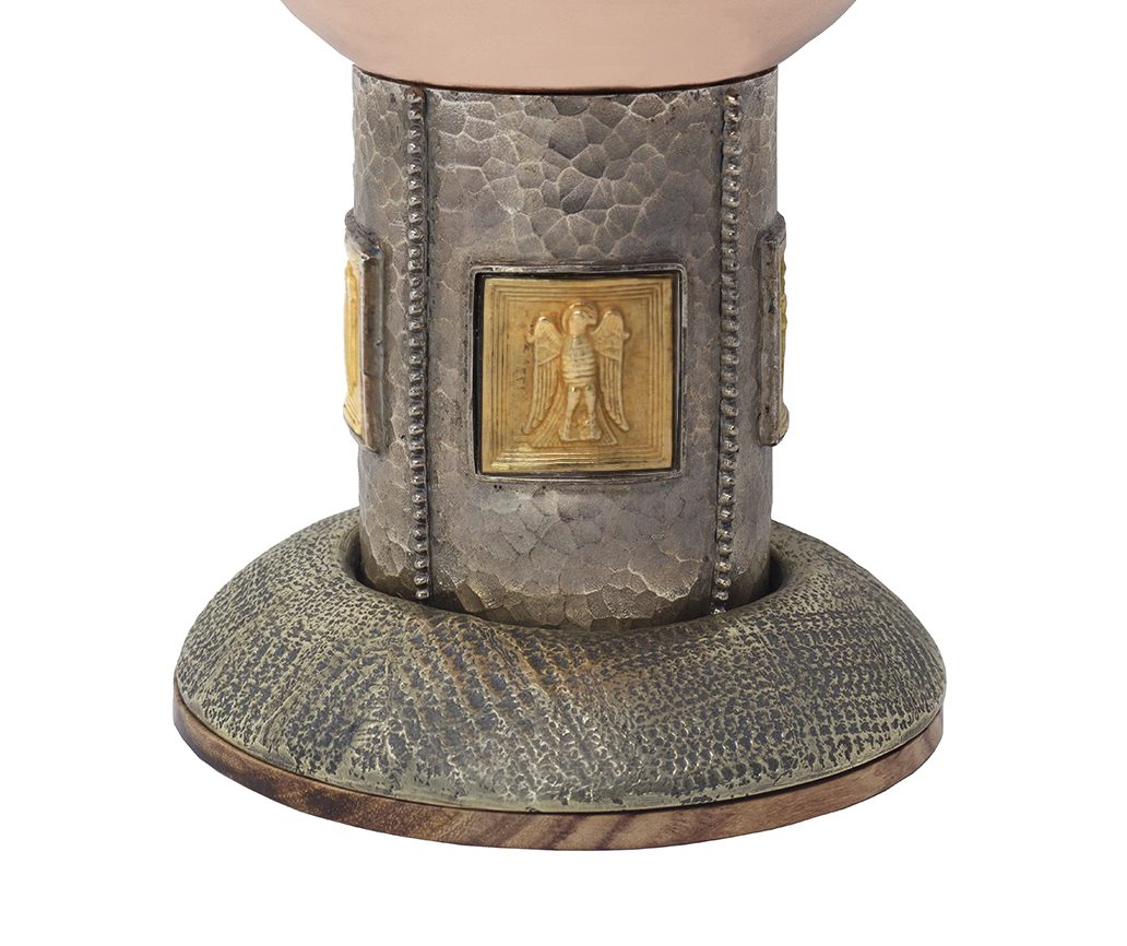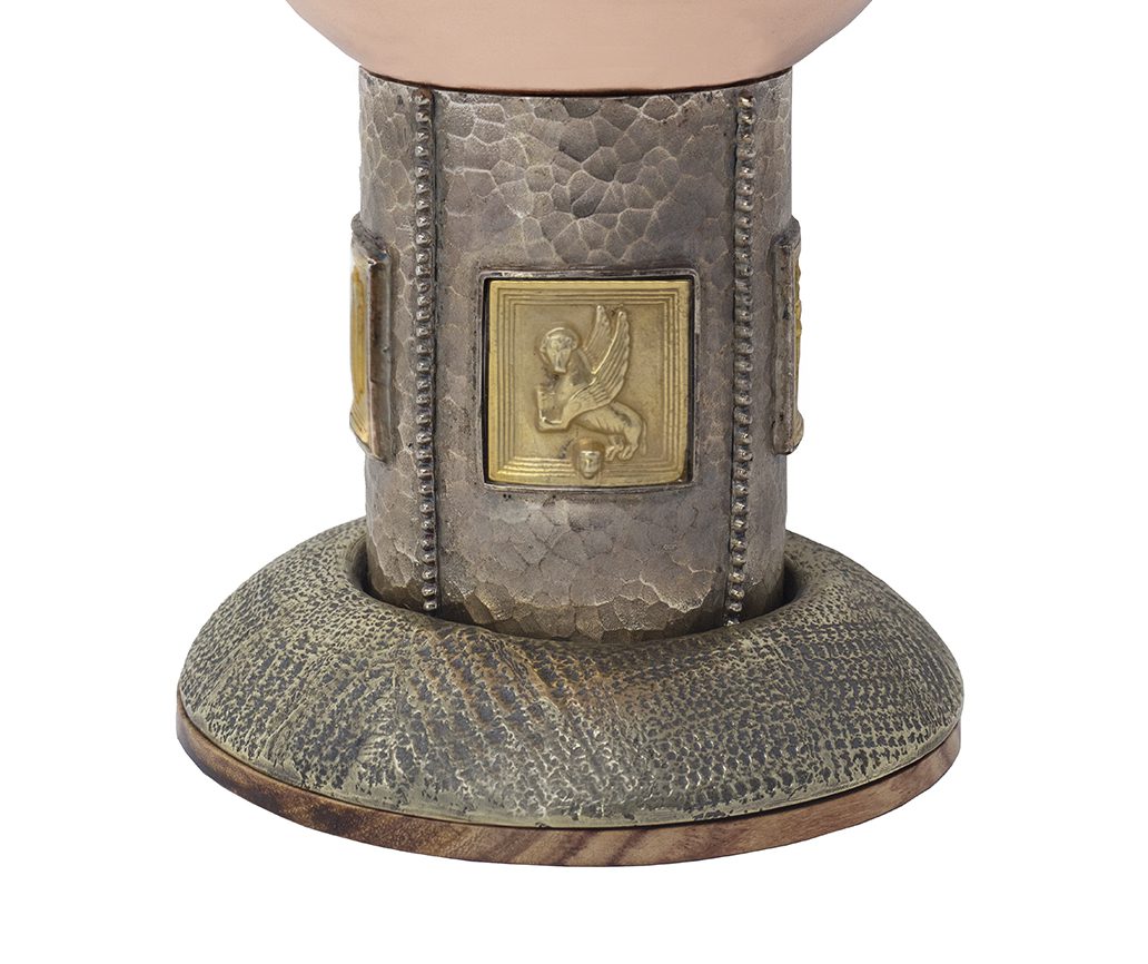 Realizzato da oreficeria artigiana è una creazione minuziosa con coppa in rame dorata all’interno, fusto in alpacca cesellato e intagliato, con piastrelle in microfusione di argento dorato raffiguranti i simboli dei quattro evangelisti.
