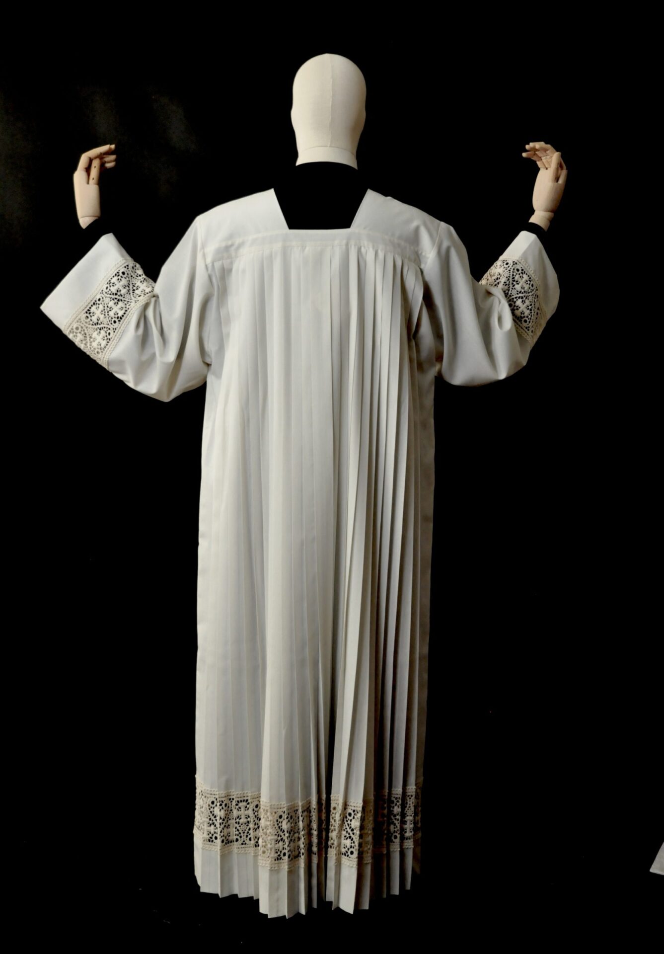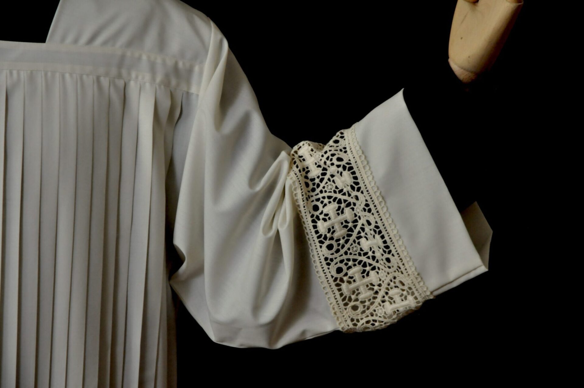 La lavorazione di questo camice richiede una grande attenzione ai dettagli. Il tessuto viene accuratamente selezionato per garantire durata e comfort, mentre il ricamo delle croci è eseguito con precisione per mantenere un aspetto armonioso. Il plissé, oltre a dare un effetto visivo raffinato, permette una maggiore vestibilità e fluidità nei movimenti, rendendolo ideale per le celebrazioni liturgiche.