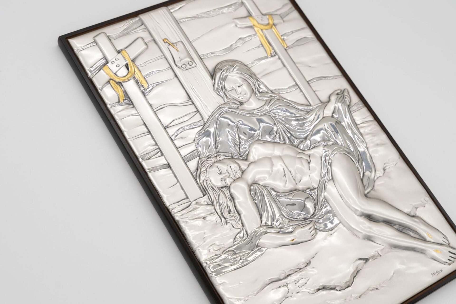 Raffigurazione della Pietà, un tema sacro che rappresenta la Vergine Maria che tiene in braccio il corpo di Gesù Cristo dopo la crocifissione.
