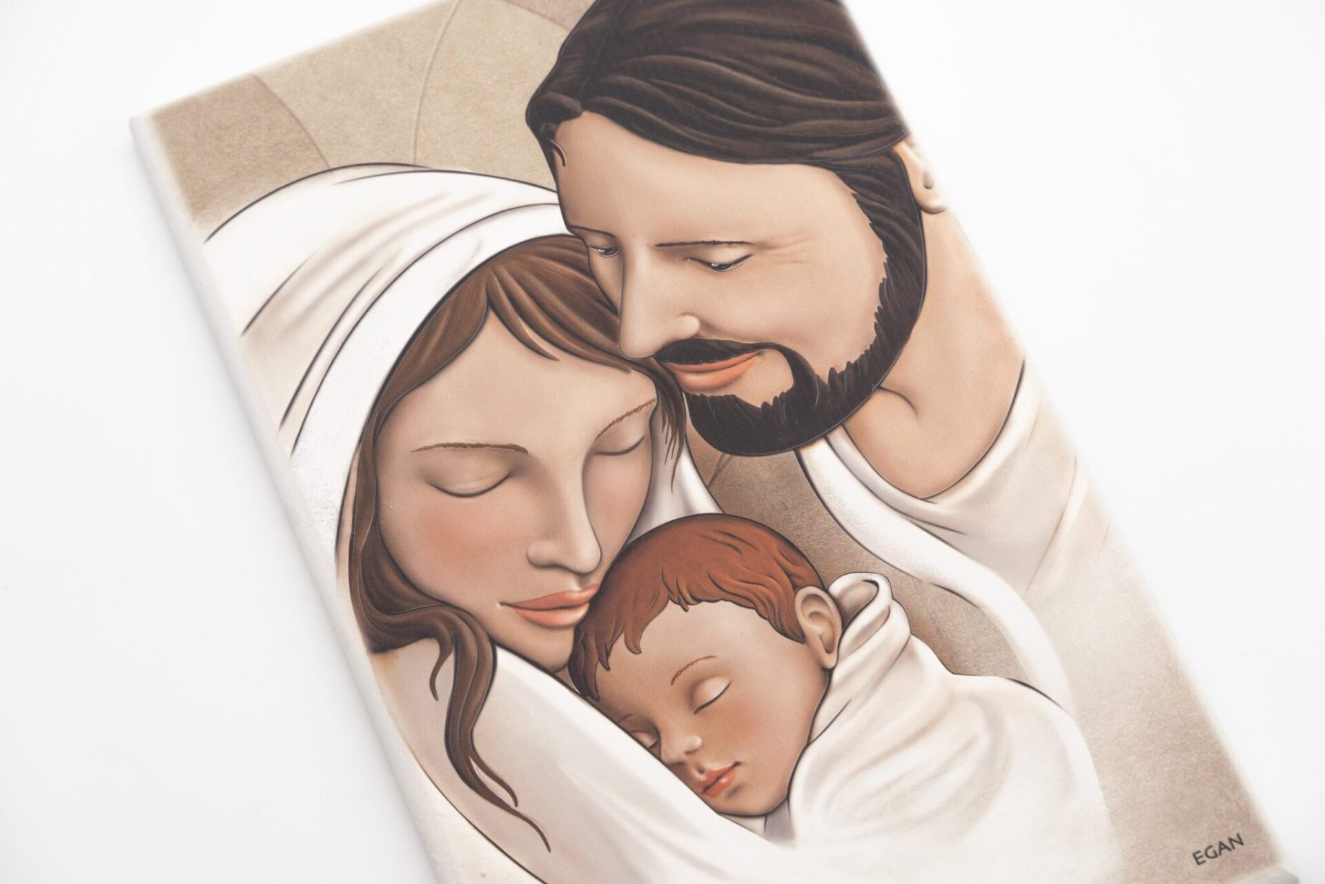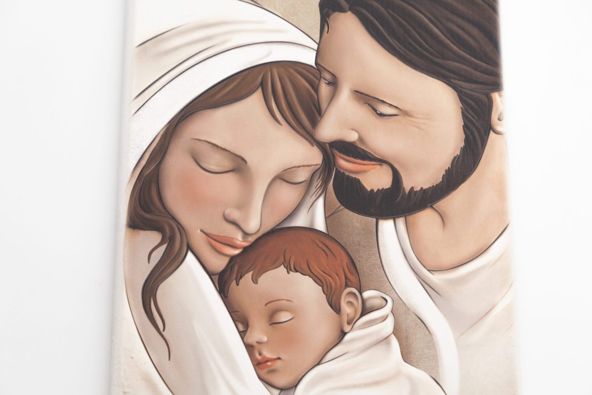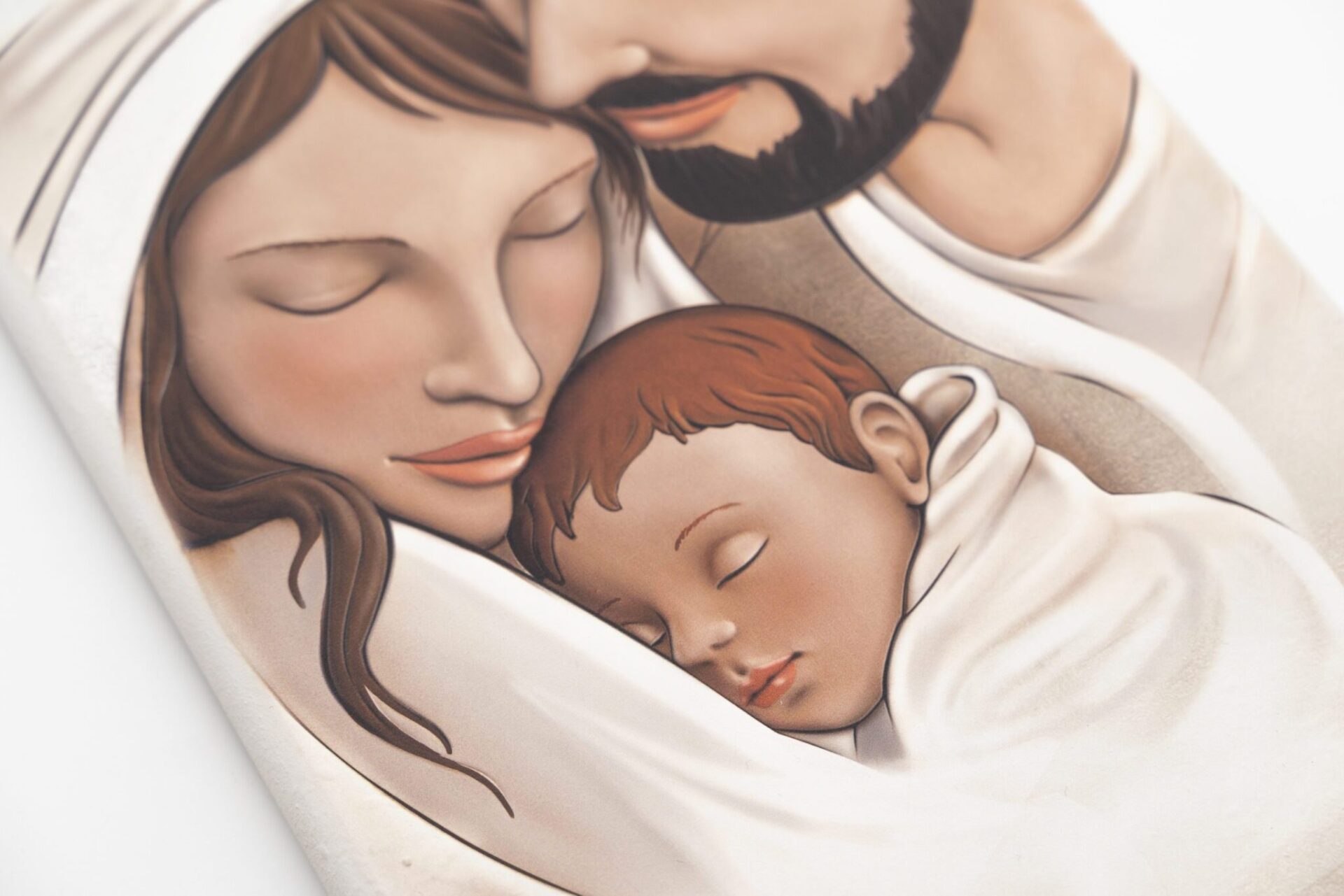 La Sacra Famiglia è raffigurata con Gesù Bambino al centro, la Madonna e San Giuseppe ai lati, con dettagli che esaltano la tenerezza e l’amore familiare.