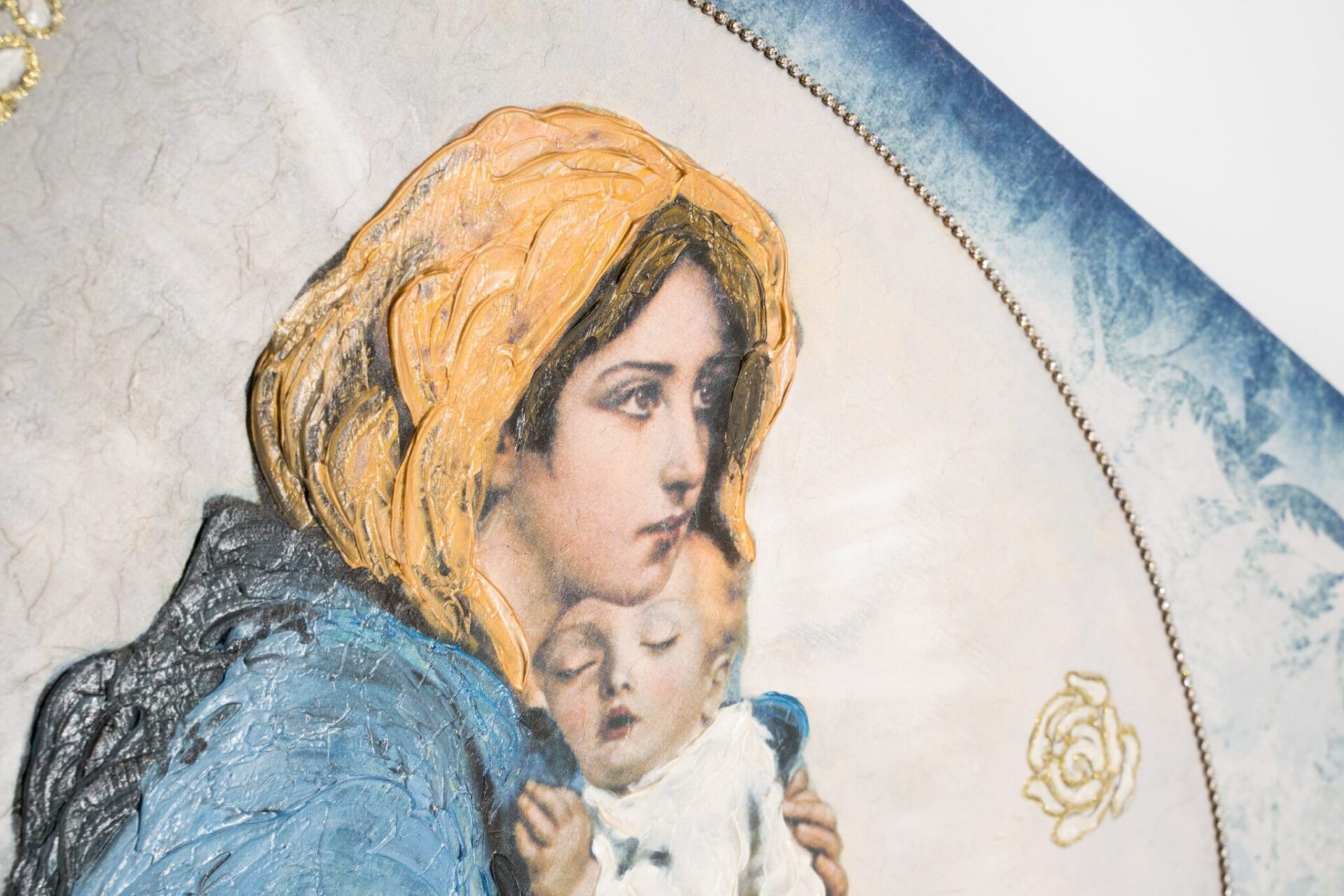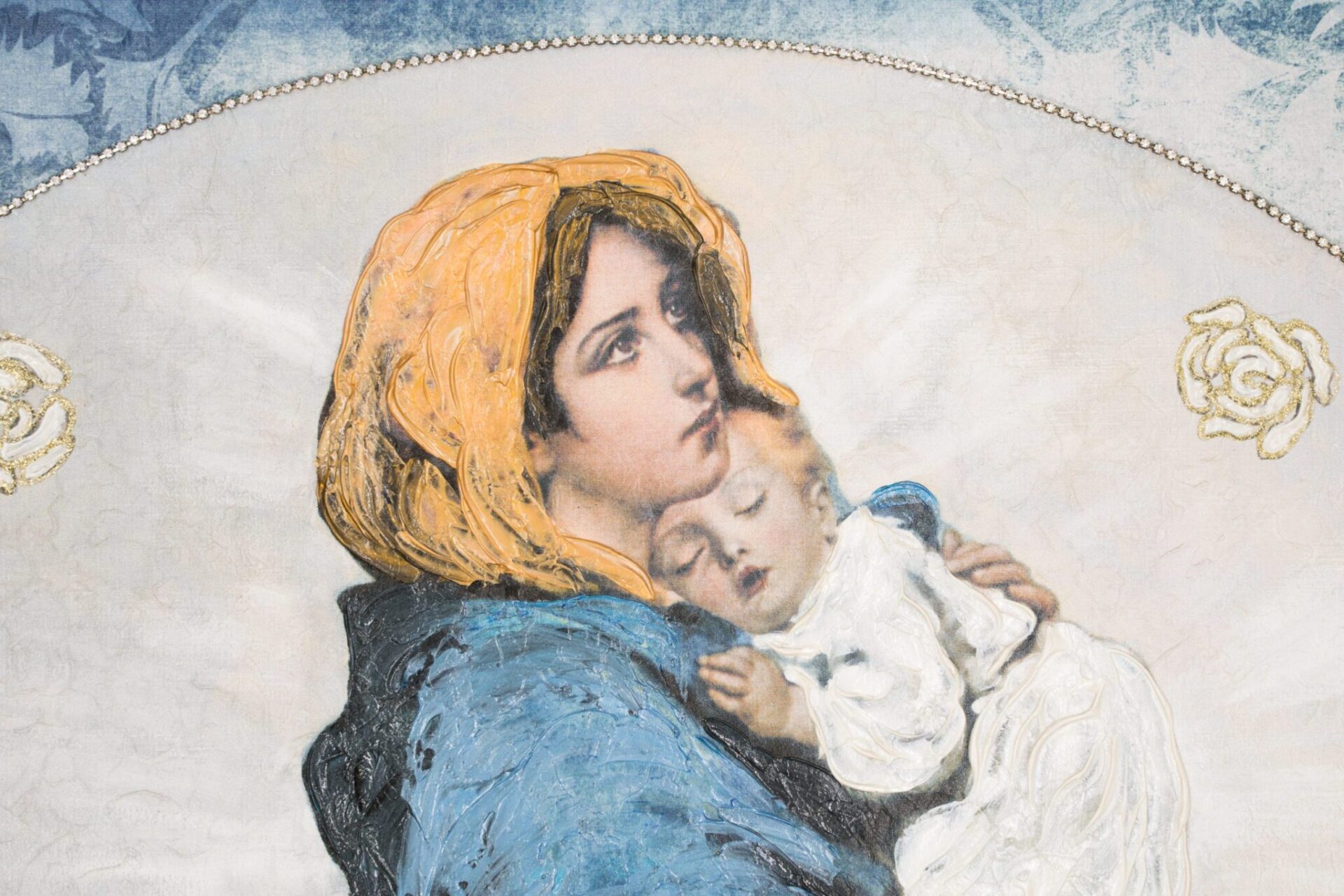 Questa tela è stata impreziosita con piccoli punti luce di brillantini sintetici e rifinita con effetto pittorico.