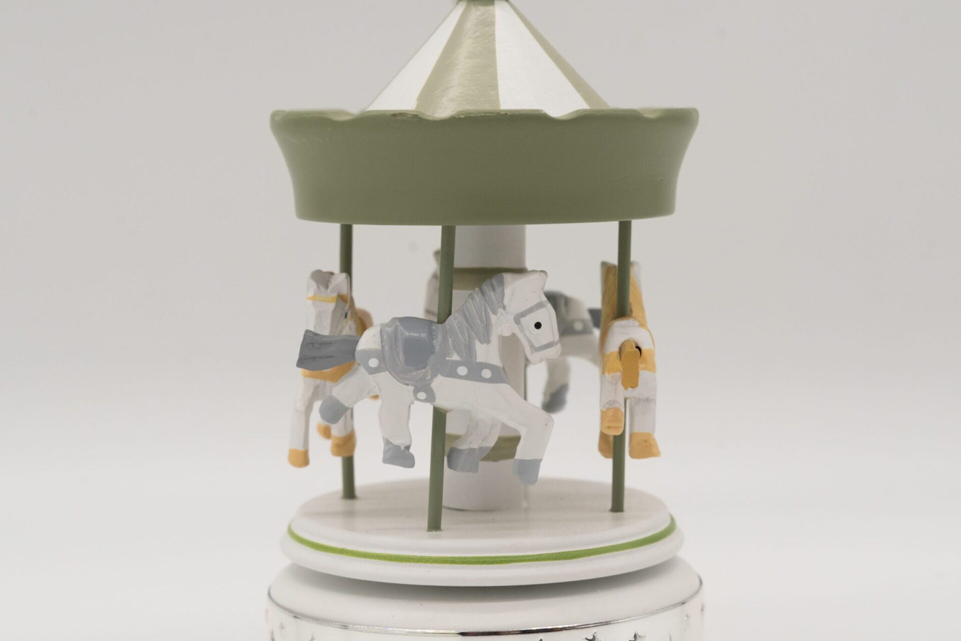 Un magnifico carillon giostrina realizzata in legno ben dettagliata, con un’attenzione particolare ai piccoli elementi decorativi. I cavalli bianchi sono adornati con briglie e selle dorate, conferendo loro un aspetto elegante e fiabesco.