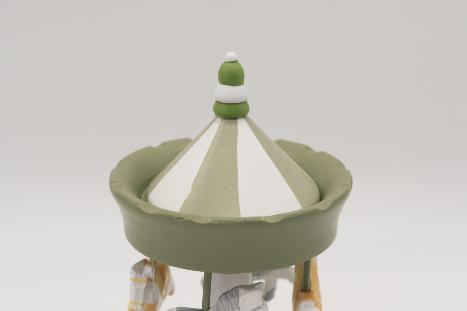 La base della giostra è ornata con un motivo a stelle argentate su sfondo verde, creando un contrasto visivo piacevole.