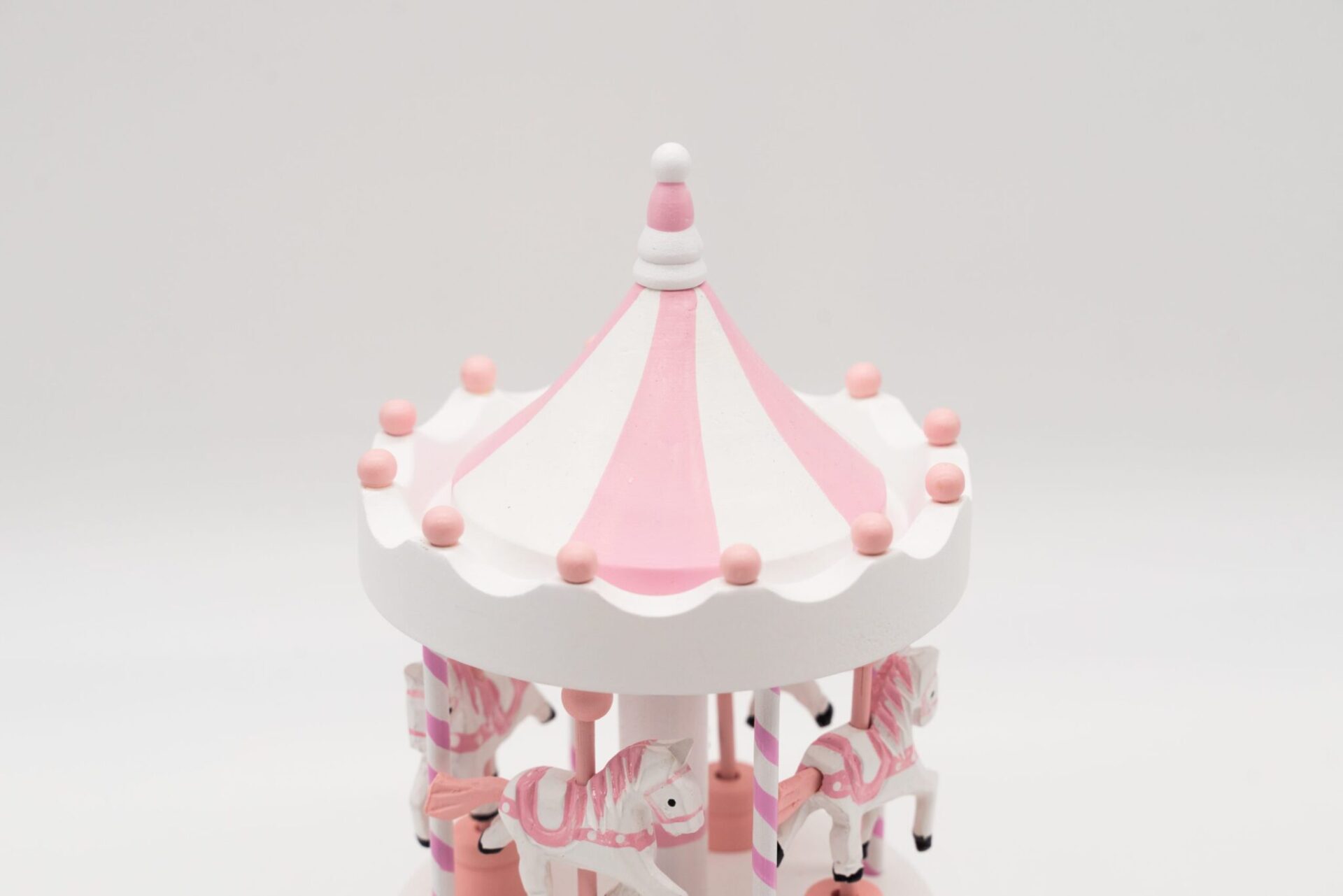 Il tetto della giostra è principalmente bianca e rosa, con un tetto conico ornato con palline rosa sui bordi.