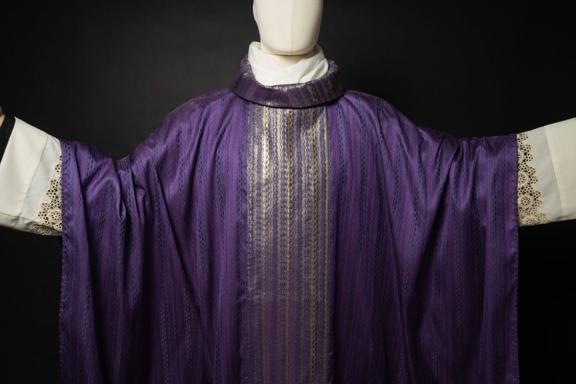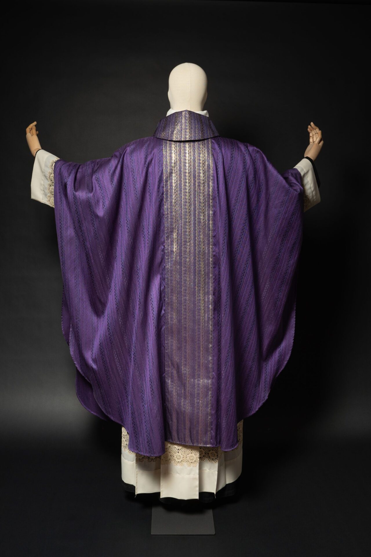 Casula in viola scuro, interamente realizzata a mano con pura seta comasca, collo ad anello in lurex e seta e costone cucito in piano. Il motivo tapisserie rende la cromia profonda ed il colore mutevole a contatto con la luce.
