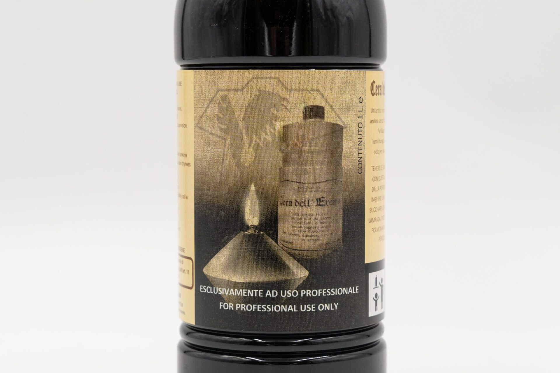 Bottiglia con tappo di sicurezza di cera liquida dell’Eremo da 1 litro, ricetta specifica per liturgia, completamente inodore ed antifumo.