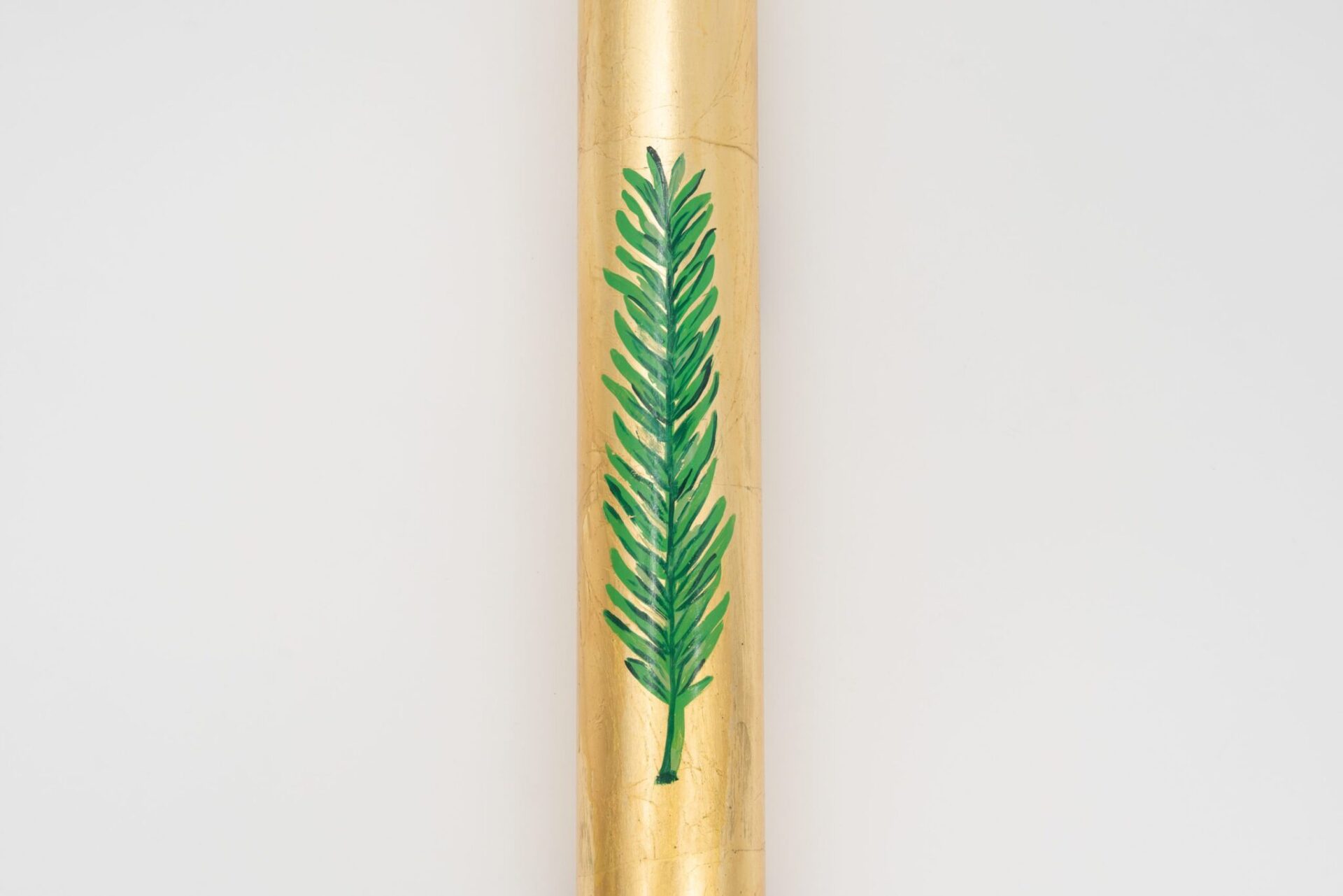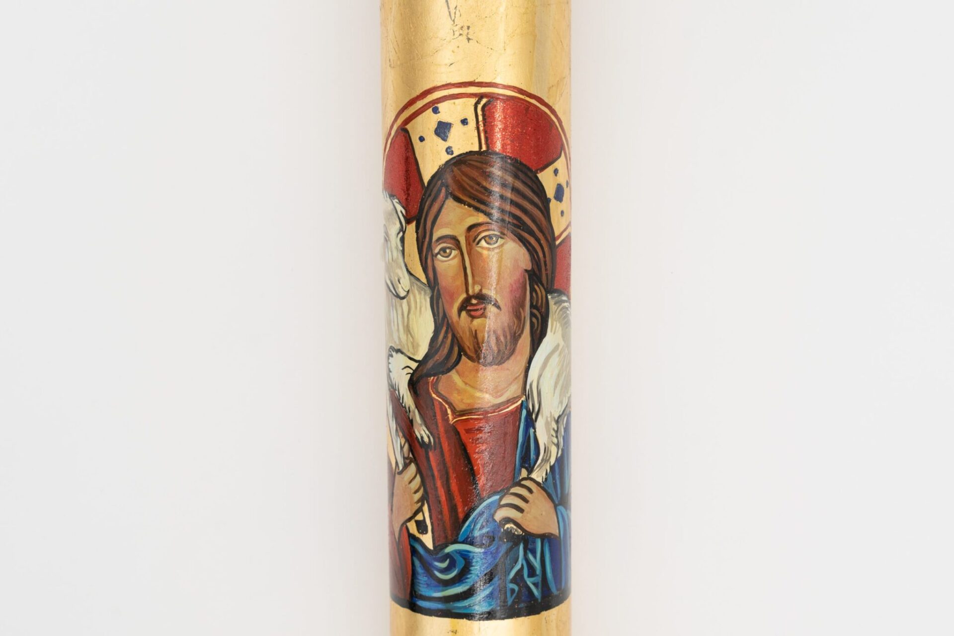 Cero Pasquale “Buon Pastore” dipinto a mano in foglia d’oro del diametro di 8 cm e altezza 120 cm.