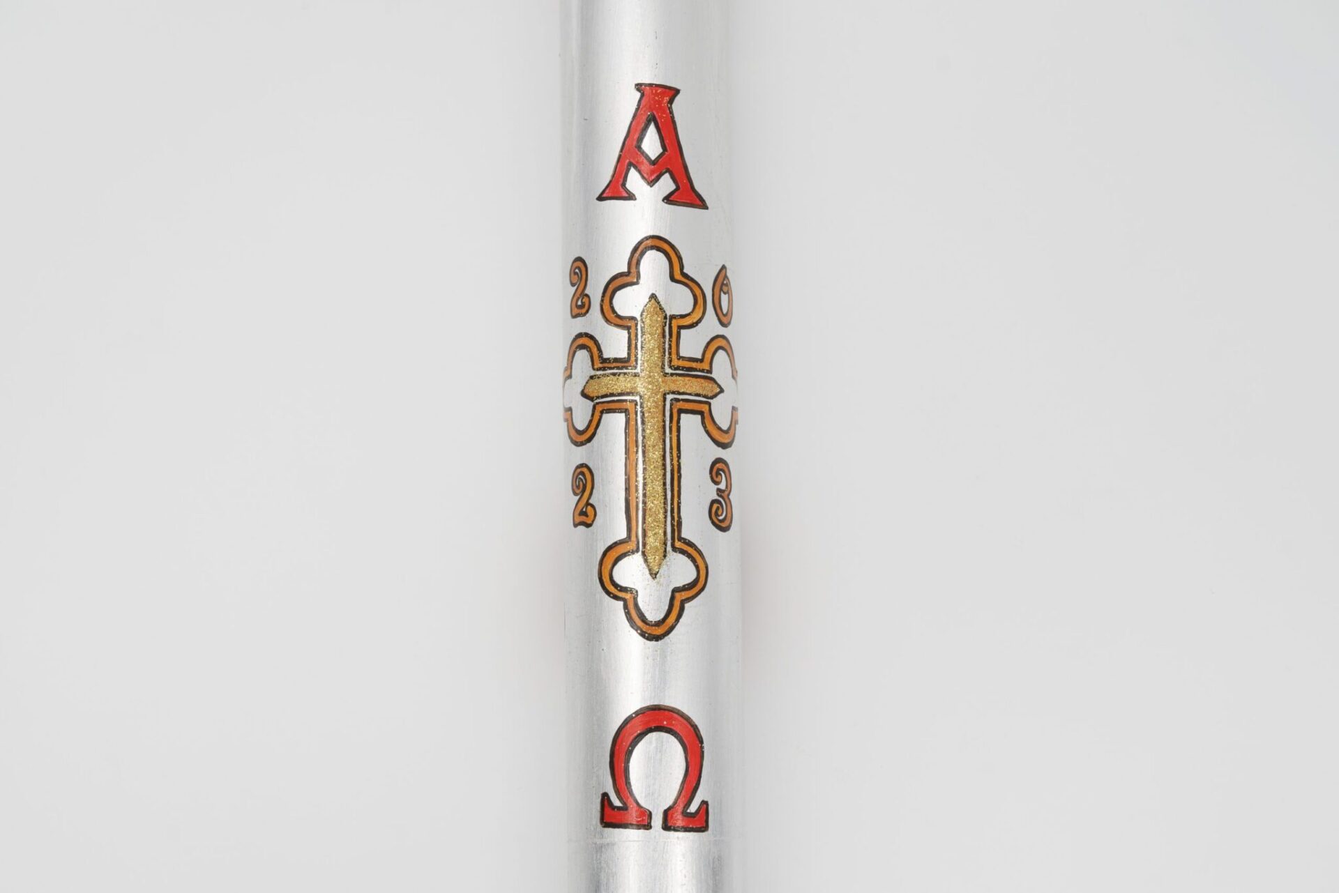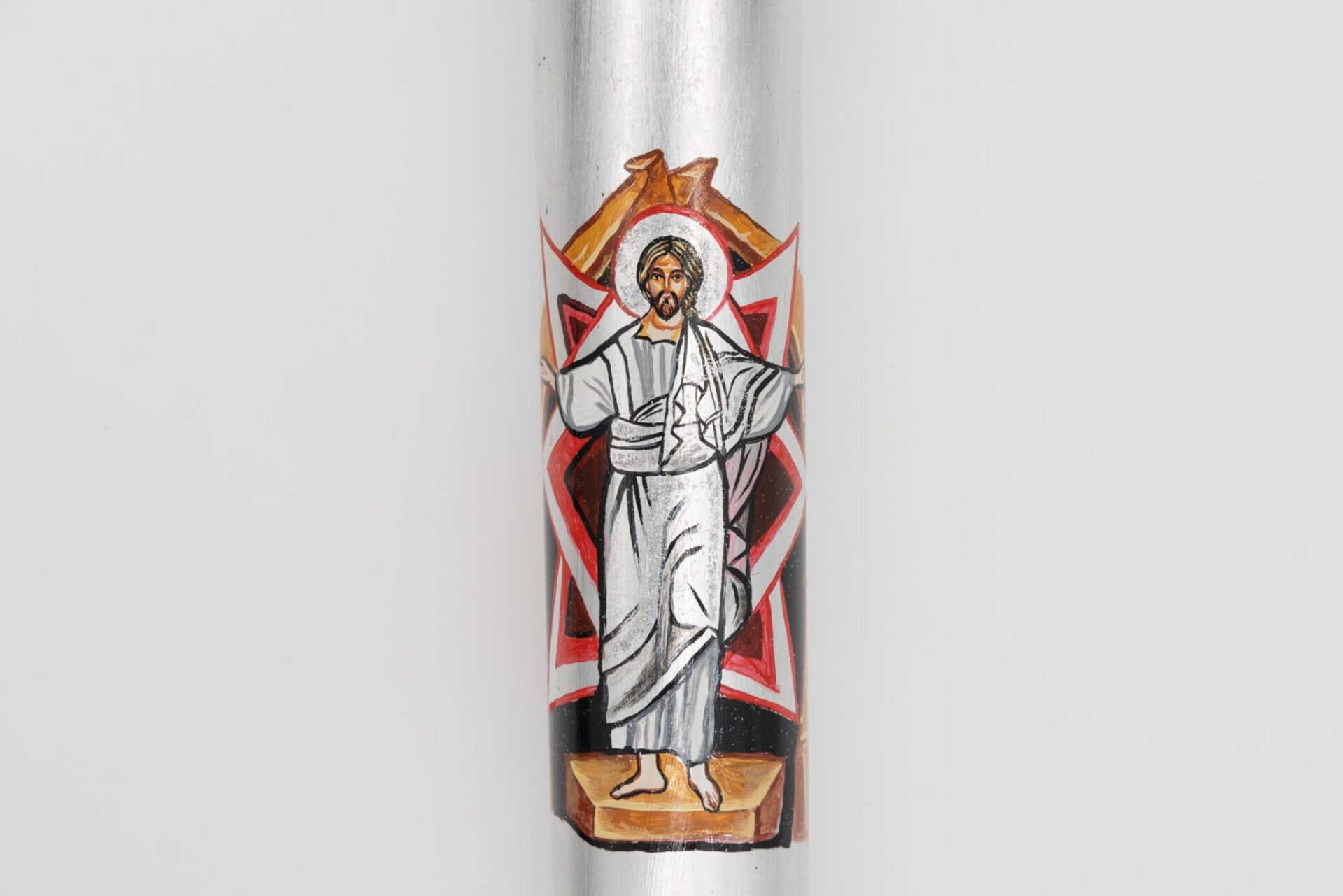 Cero Pasquale “Cristo Risorto” dipinto a mano su foglia d’argento, diametro di 8 cm e altezza 120 cm.