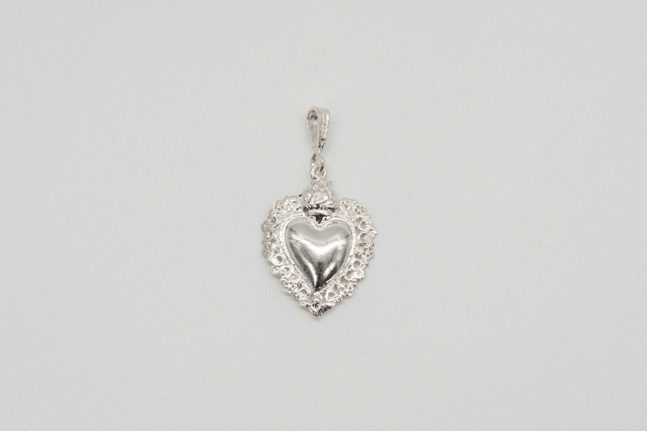 Un simbolo di fede e protezione, realizzato con maestria artigianale. Questo ciondolo Ex Voto raffigura il Sacro Cuore ed è interamente lavorato in argento, con finiture che ne esaltano la spiritualità e il pregio.