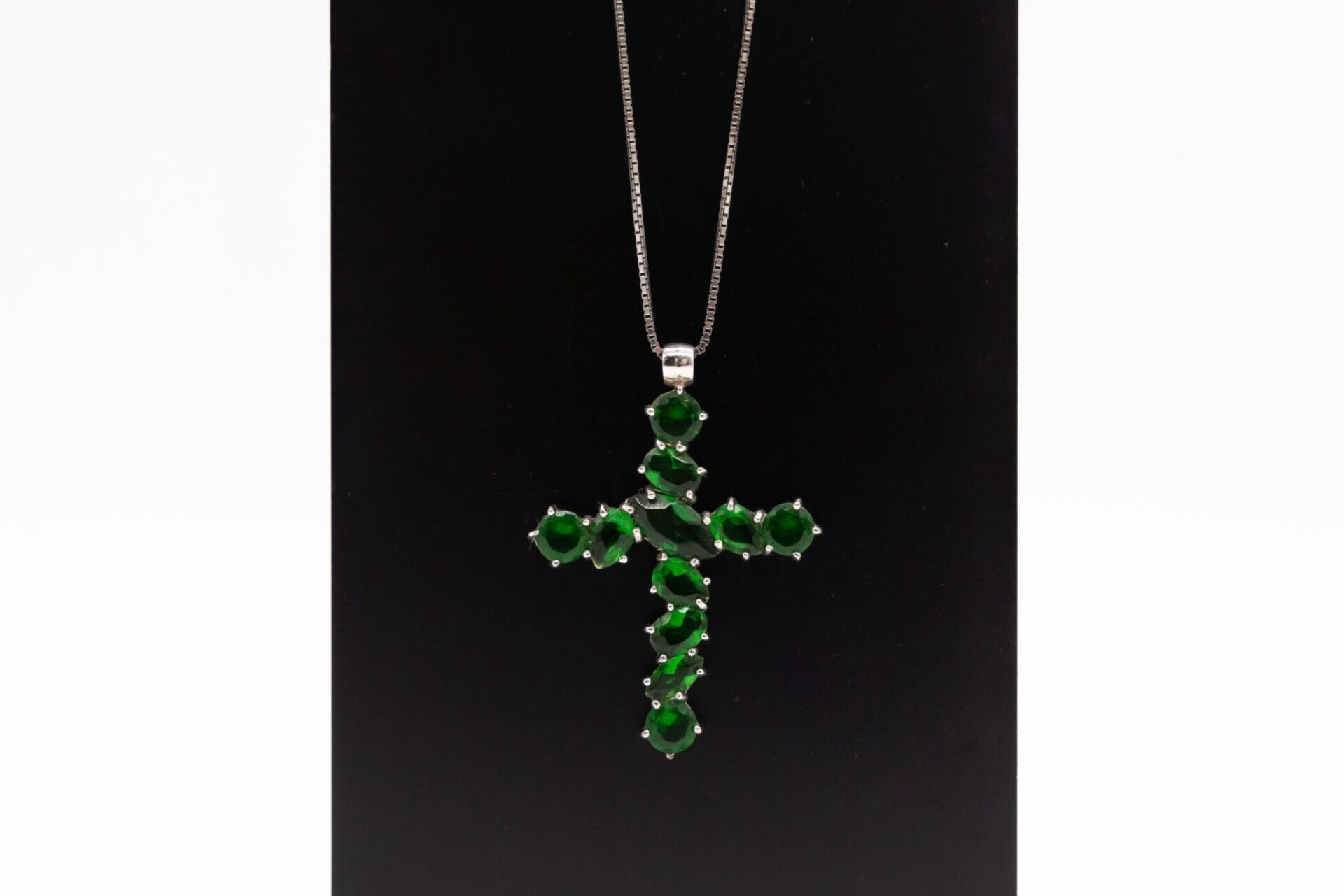 La collana è in argento con una croce pendente con pietre Swarovski pietre verdi, realizzata con grande attenzione ai dettagli e dimostra un’eccellente maestria nella lavorazione. Questo tipo di gioielleria non è solo un simbolo di fede, ma anche un’opera d’arte sacra.