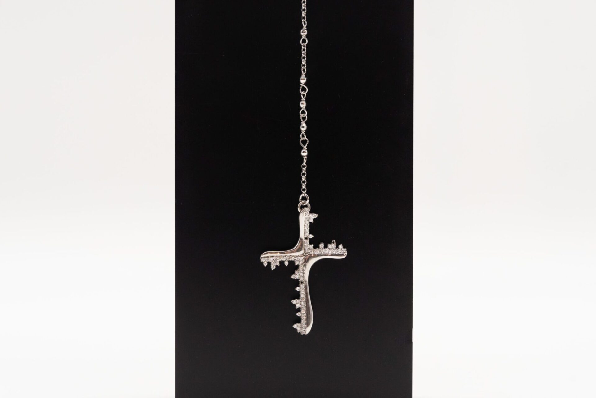 Collana in argento con croce arabesca in strass, un elegante gioiello con un pendente a forma di croce.