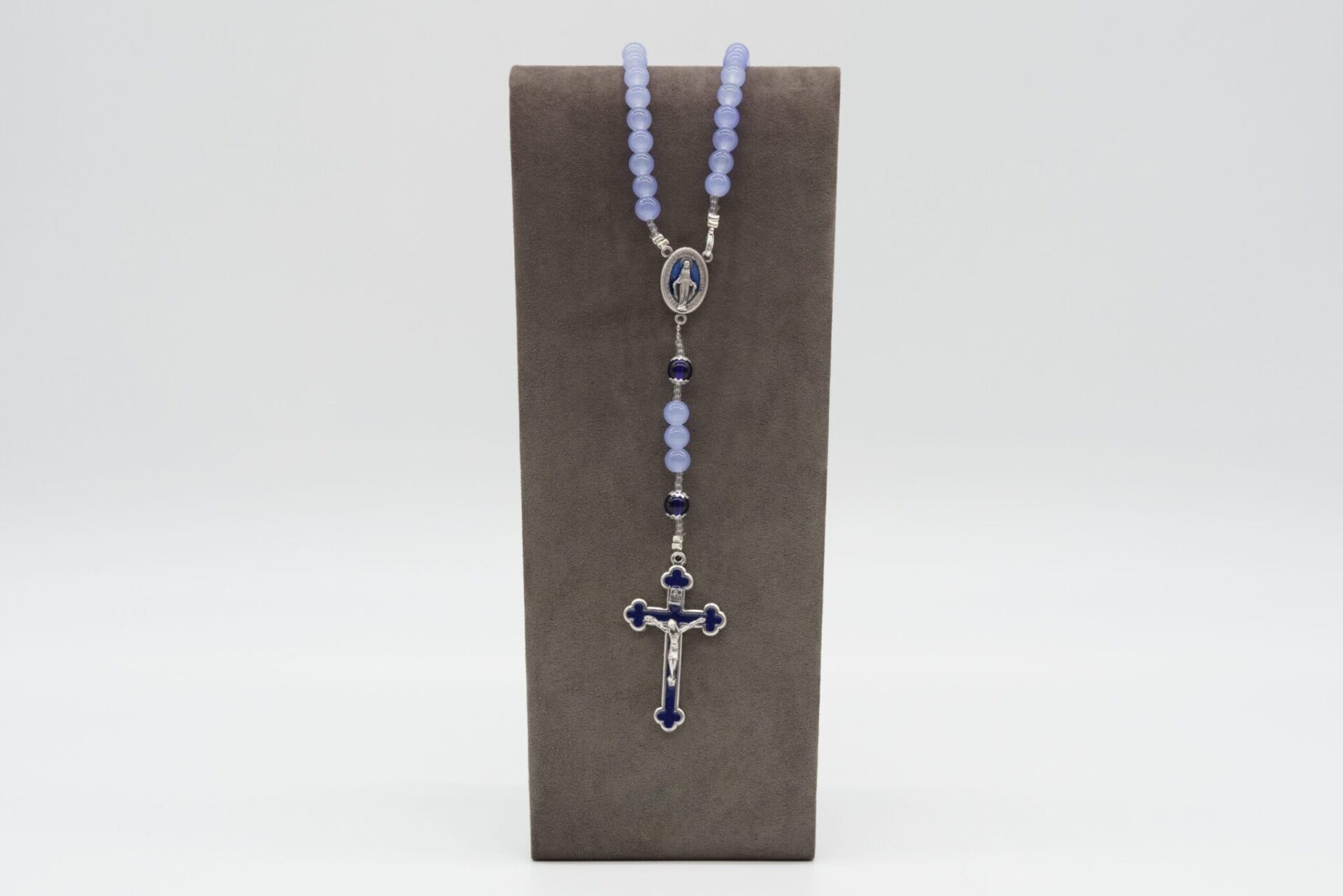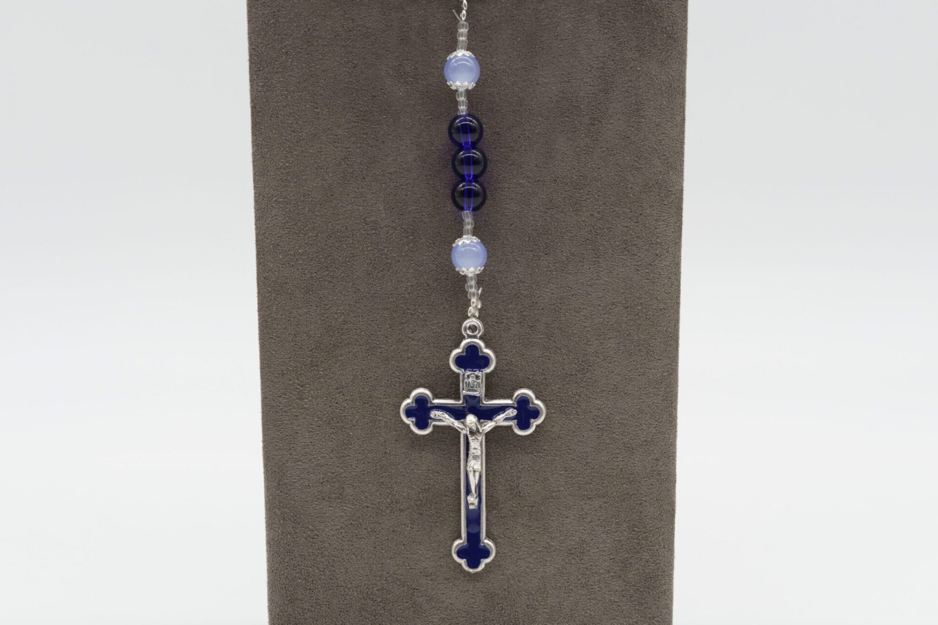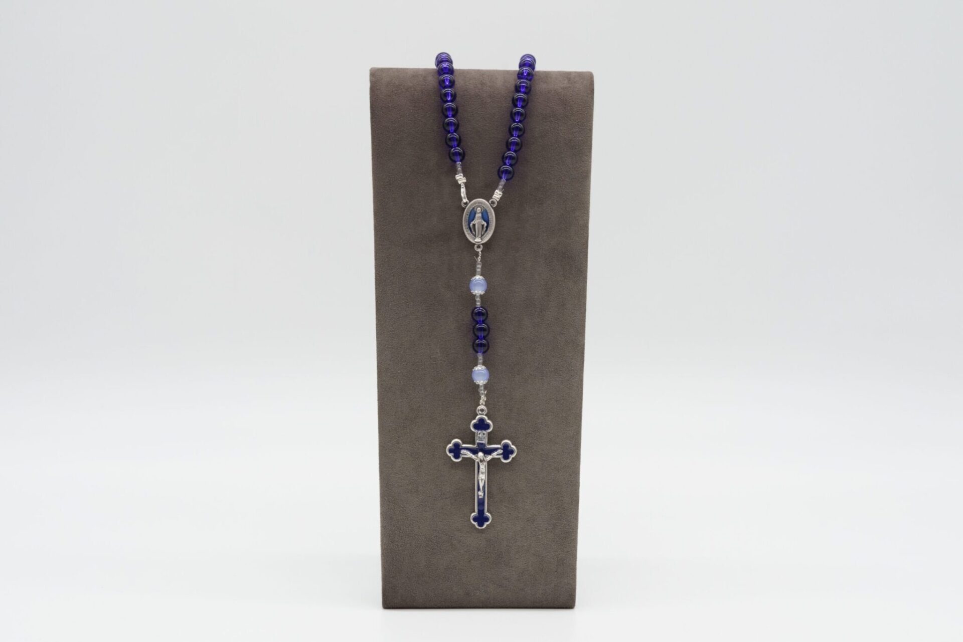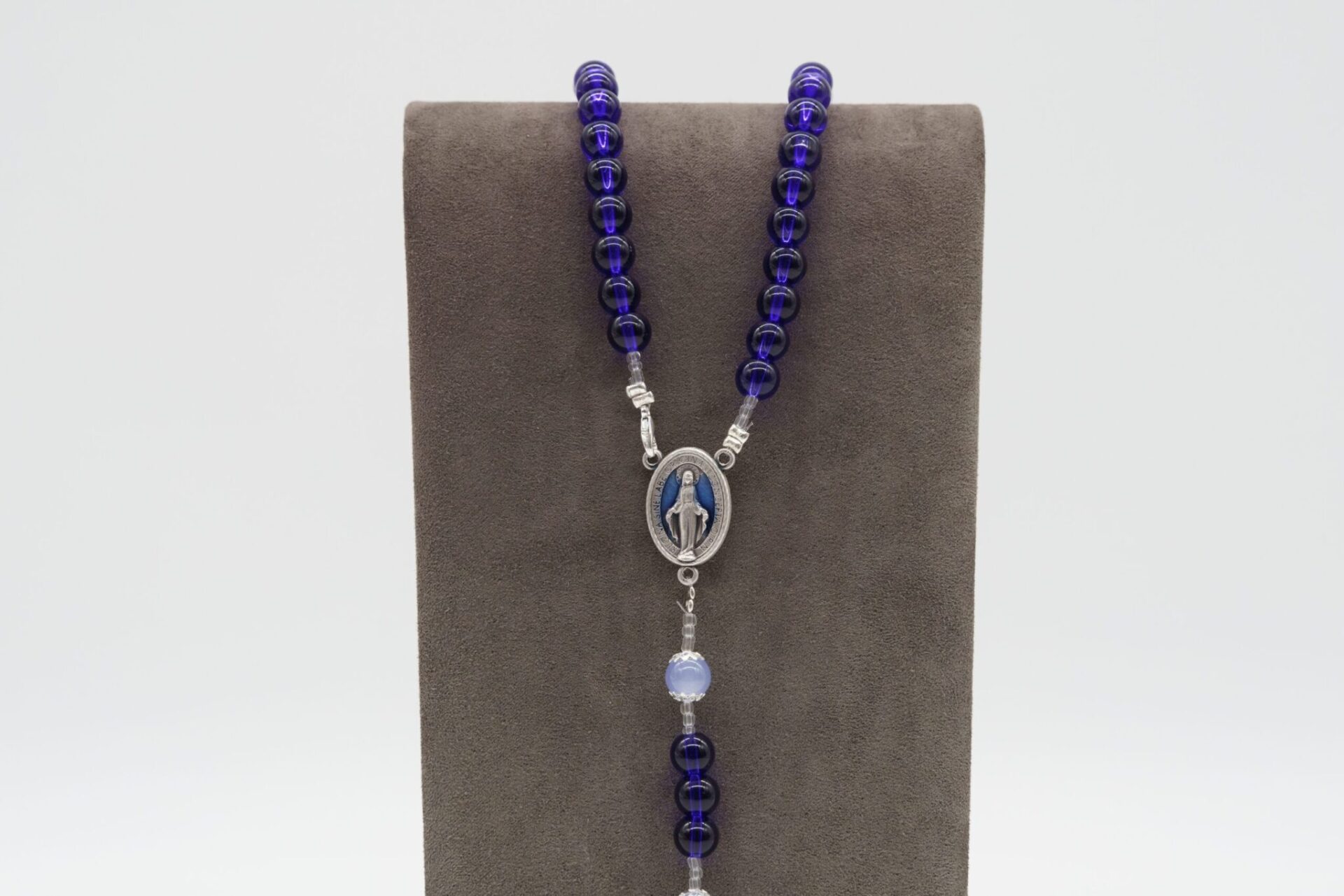 Sotto la medaglia, le perline continuano a condurre a un crocifisso argentato con dettagli in blu scuro.