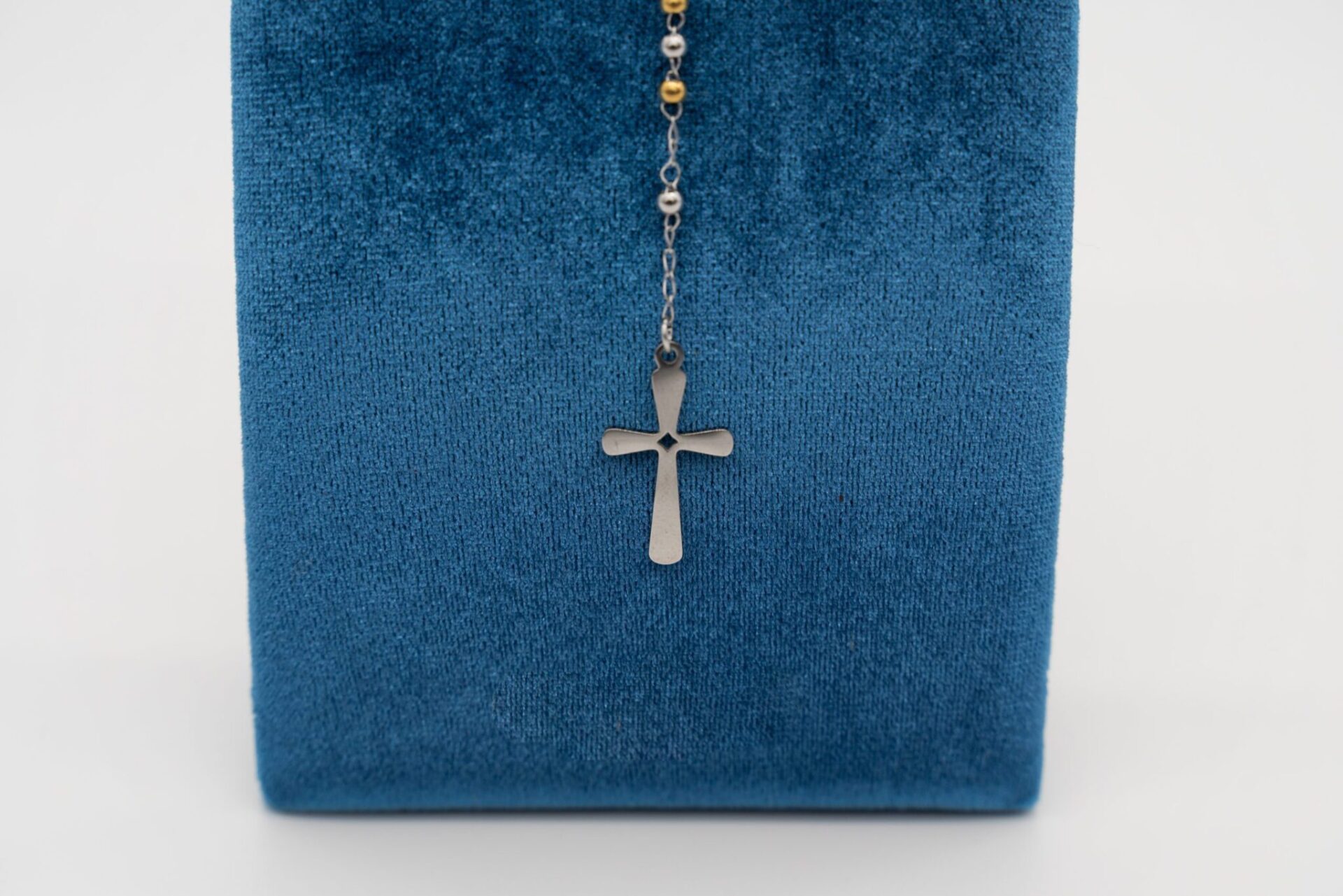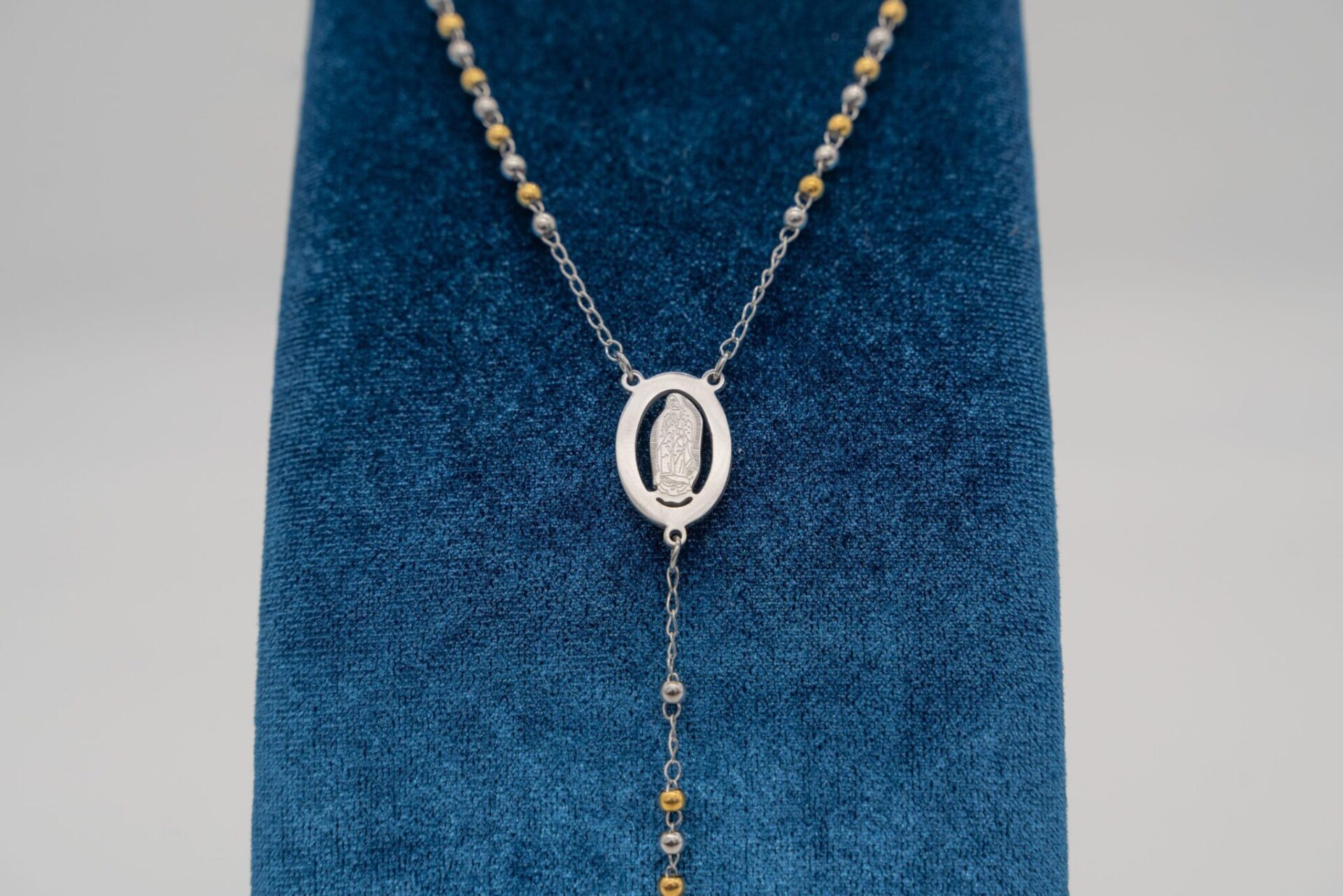 Collana Rosario in acciaio con La Madonna di Guadalupe e grani quadrati bicolore da 2mm e lunghezza totale di 30 cm.