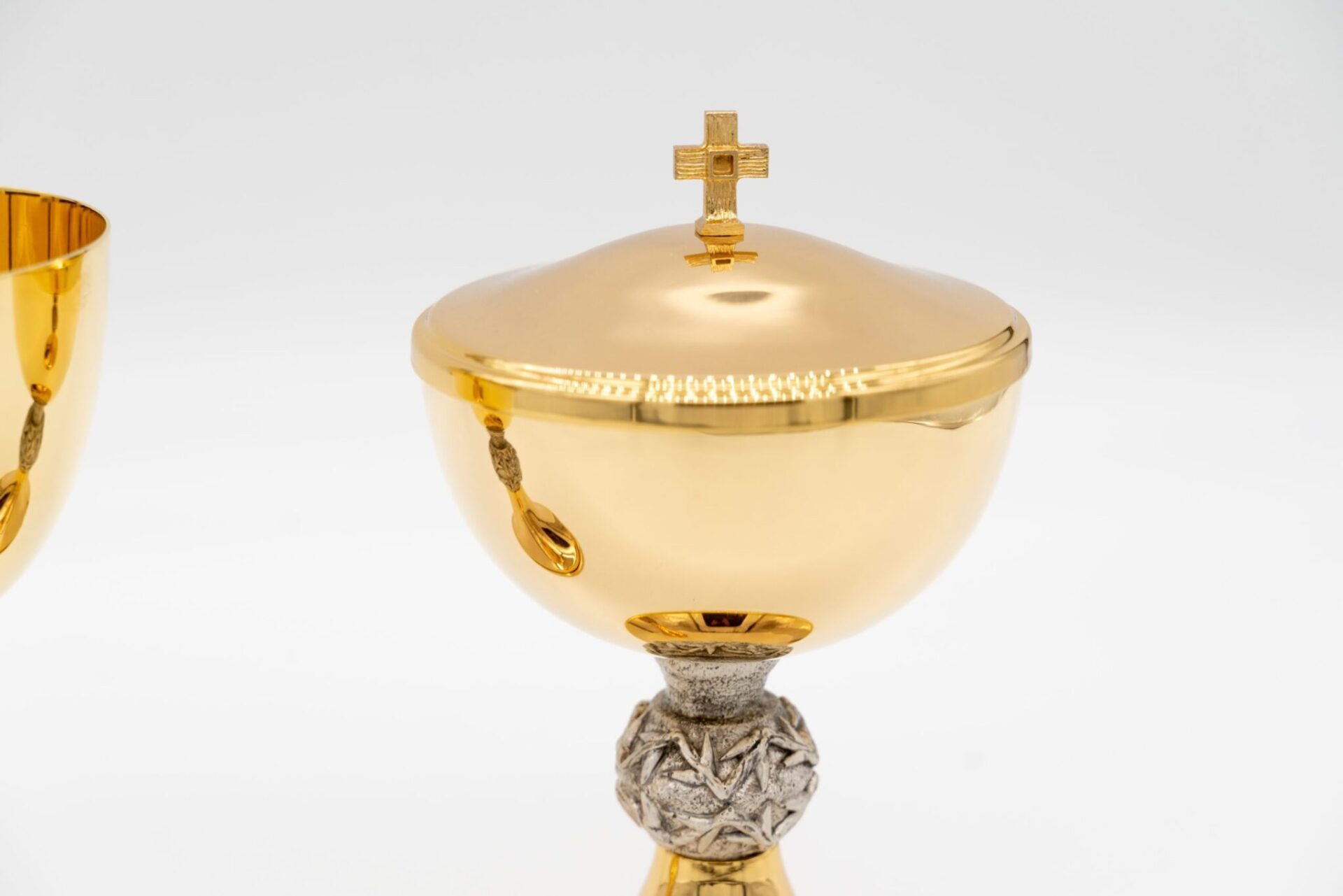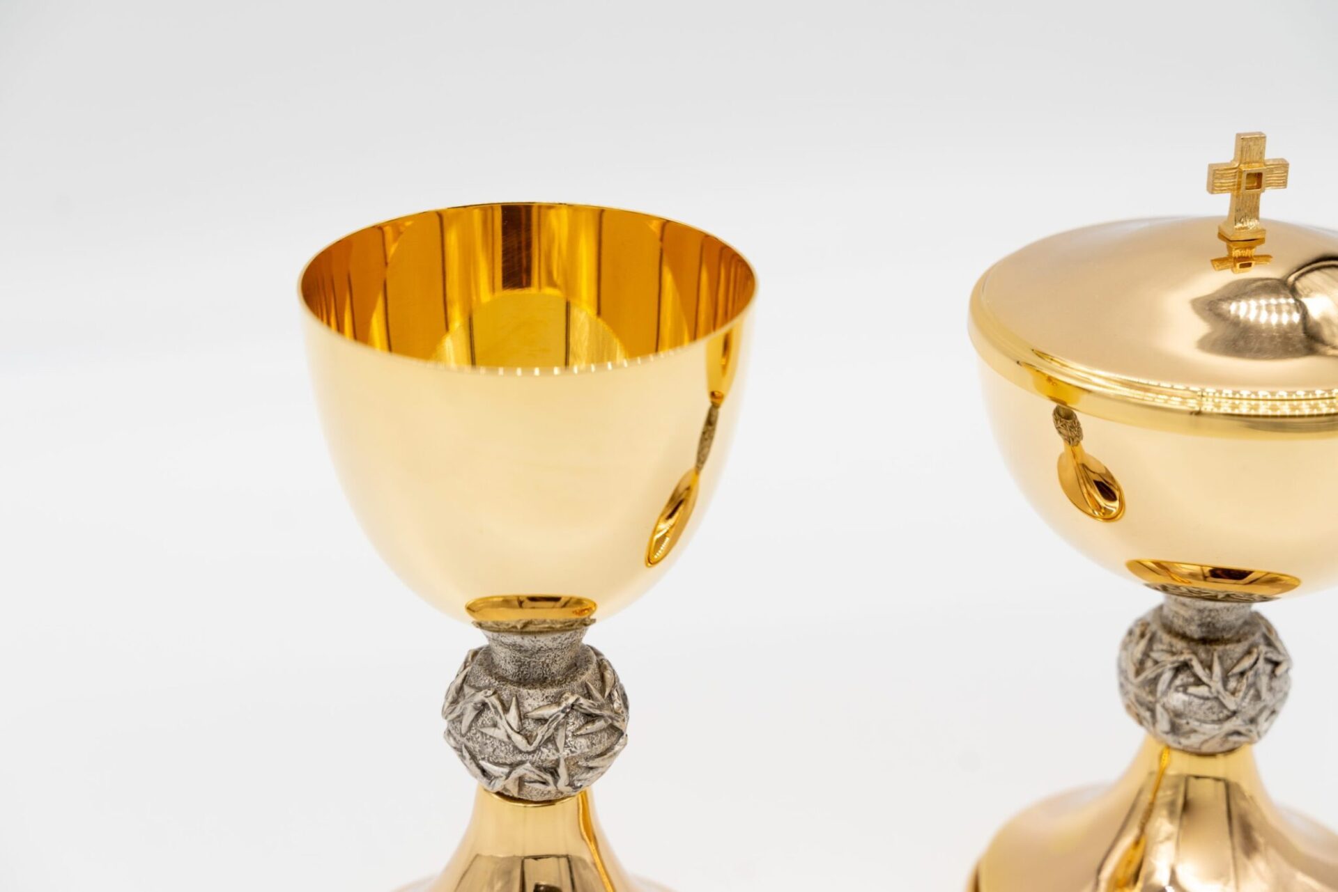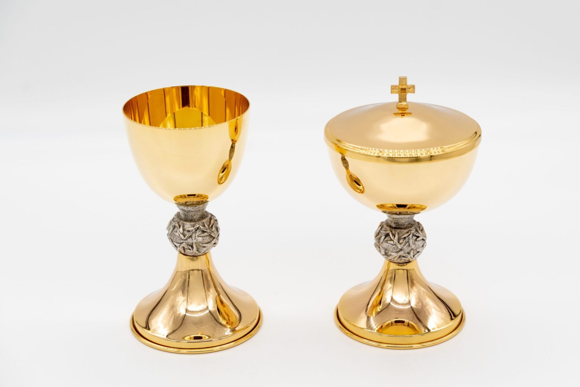 Completo calice e pisside in metallo dorato a spessore, con nodo artistico.