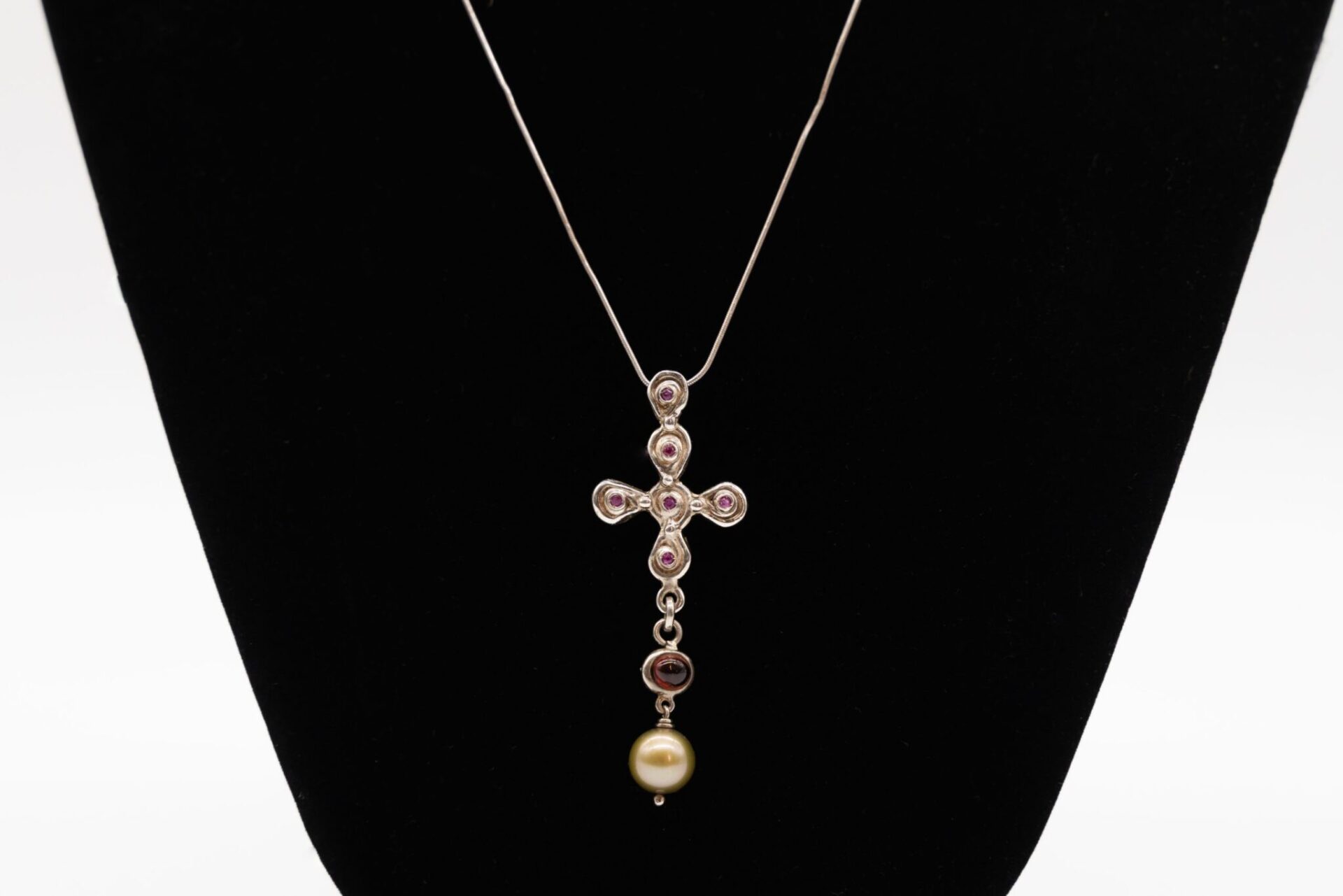 Croce in argento, con rubini, granato e perle.