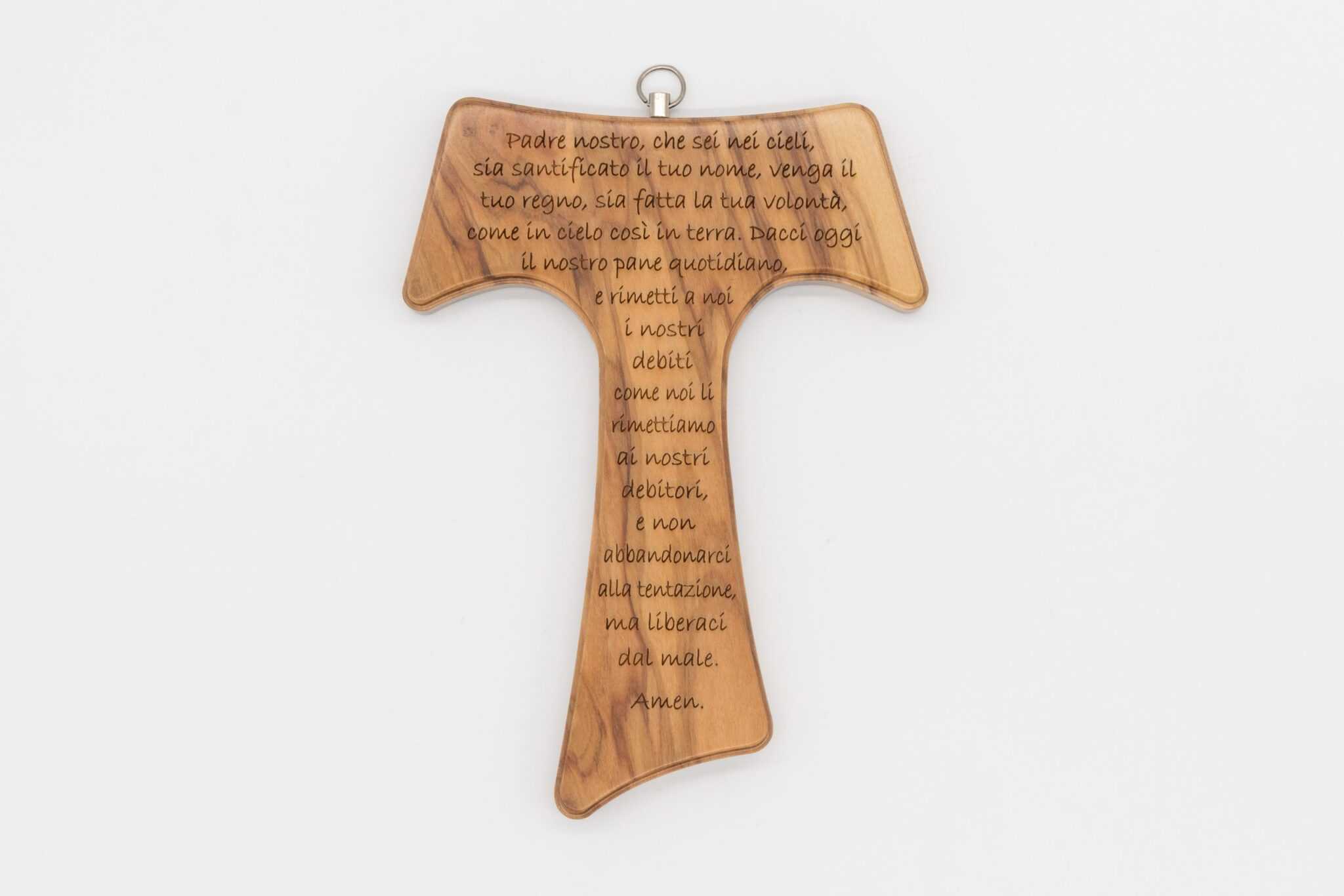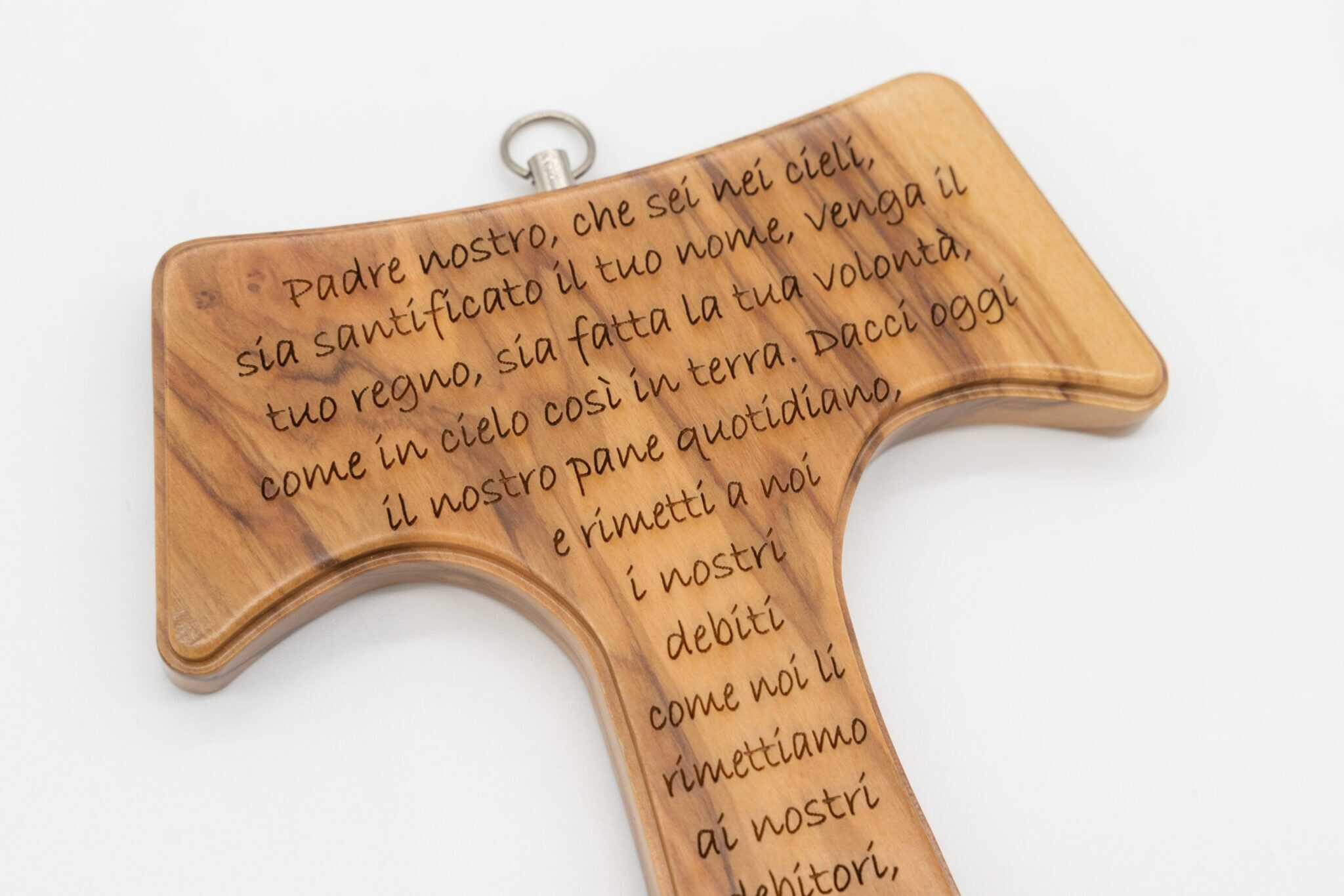 Croce TAU con inciso il Padre Nostro in pregiato legno di ulivo nazionale, finemente lavorato e curato nei dettagli.