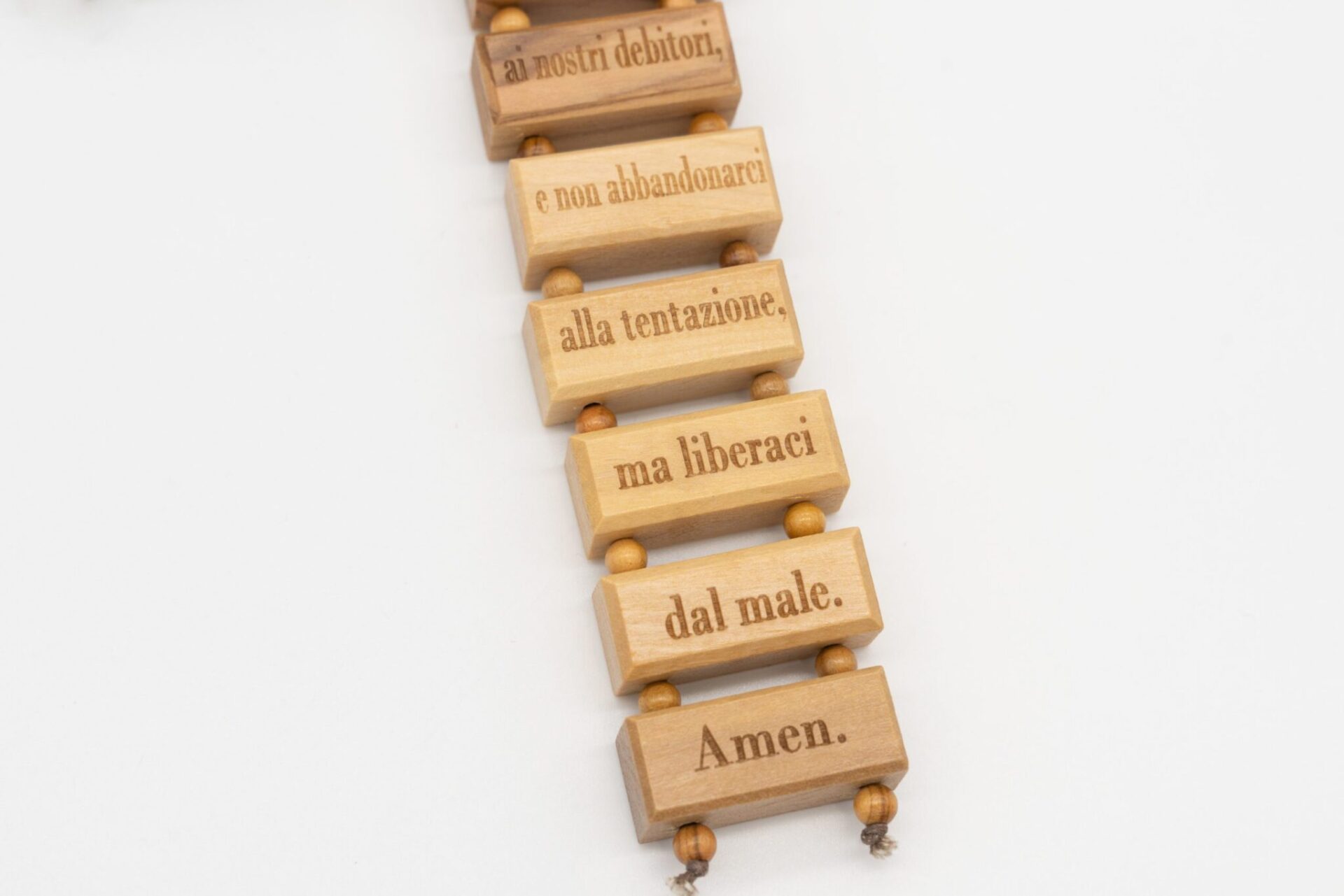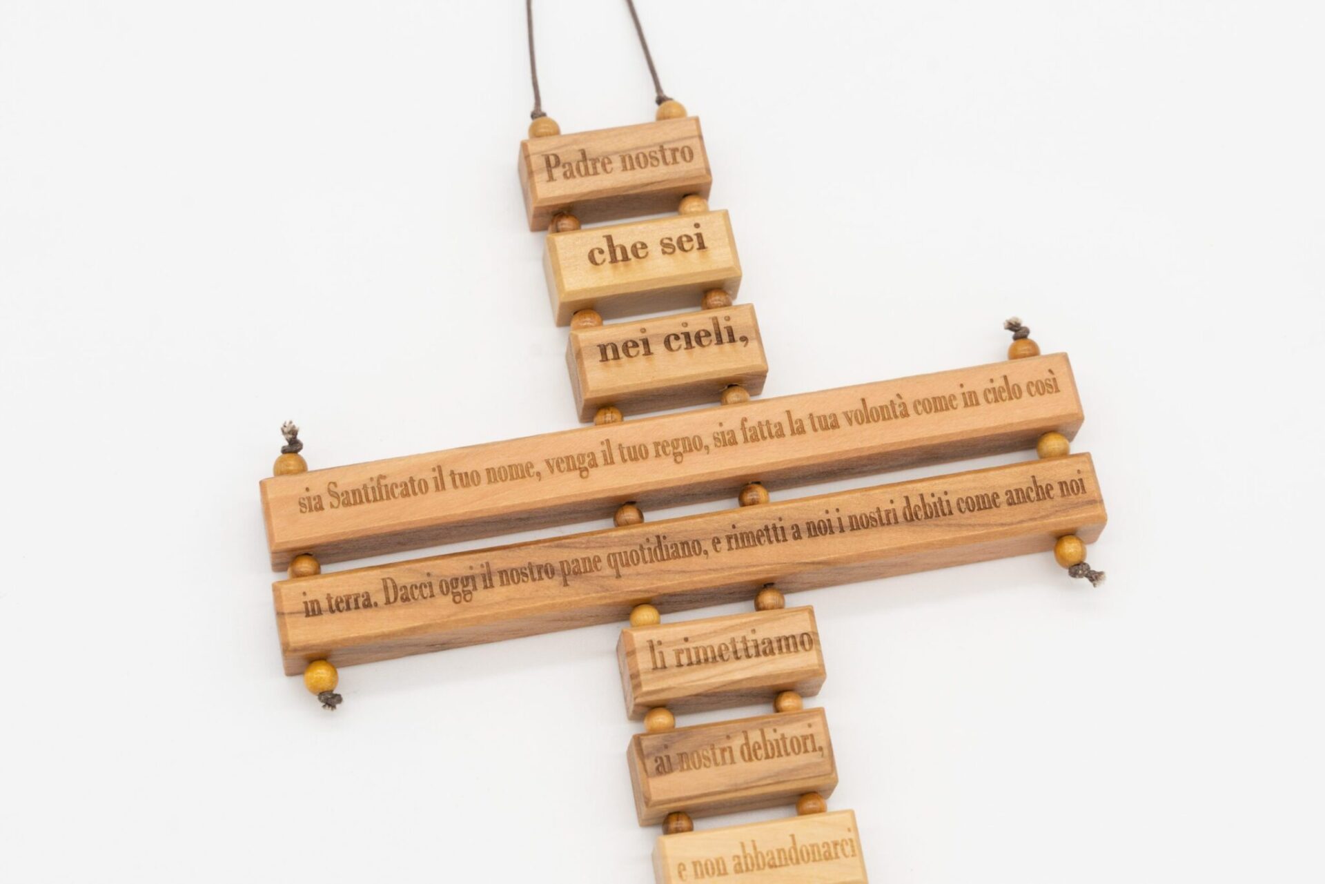 Crocifisso con grani in legno d’ulivo ed inciso il Padre Nostro.