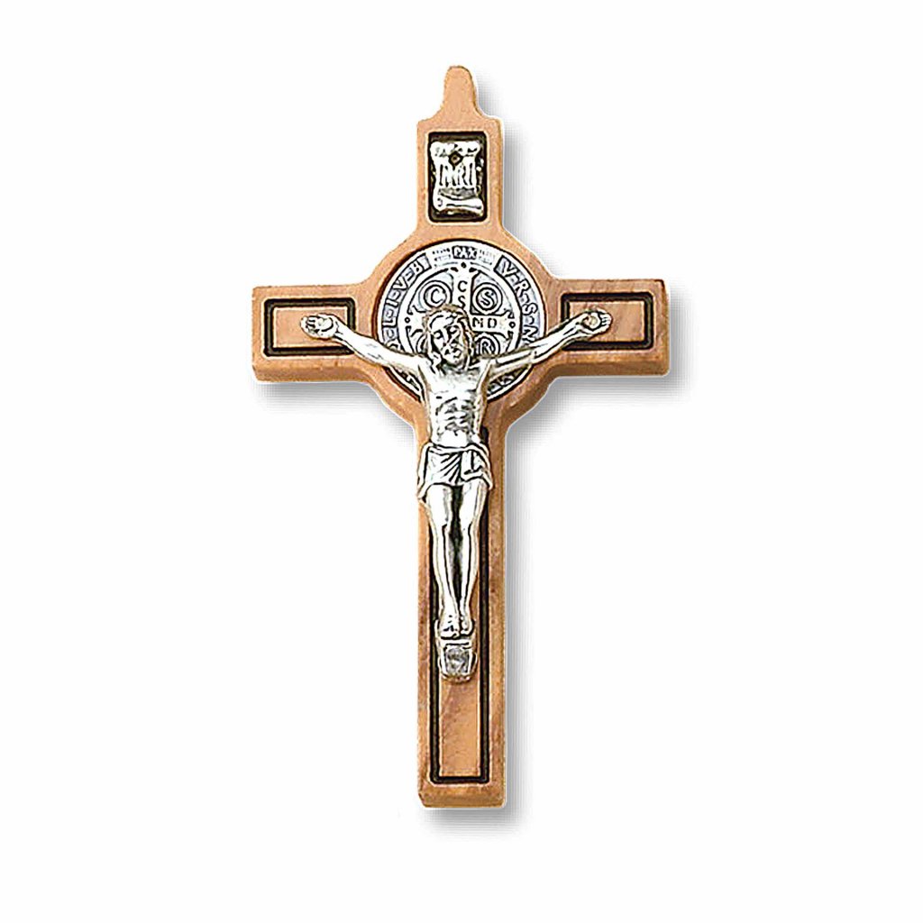 Crocifisso di San Benedetto in metallo in legno di Ulivo, con corpo di Cristo e medaglia del Santo in metallo argentato, finemente lavorato e curato nei dettagli. Essendo un prodotto artigianale, il colore del metallo può variare leggermente a seconda della brunitura.