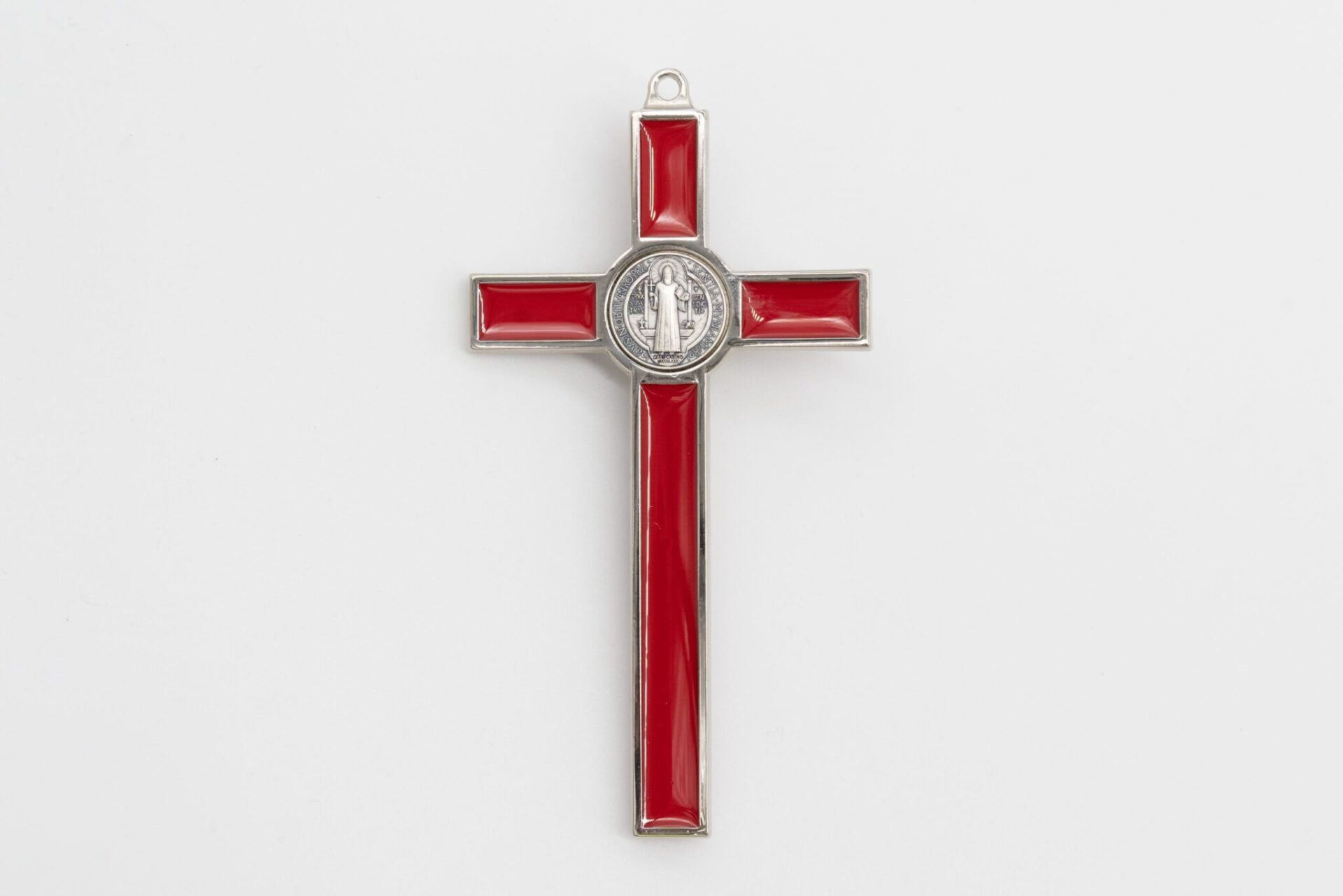 Crocifisso di San Benedetto in metallo color argento e smalto rosso lucido, con corpo di Cristo e medaglia del Santo in metallo argentato, finemente lavorato e curato nei dettagli. Essendo un prodotto artigianale, il colore del metallo può variare leggermente a seconda della brunitura.