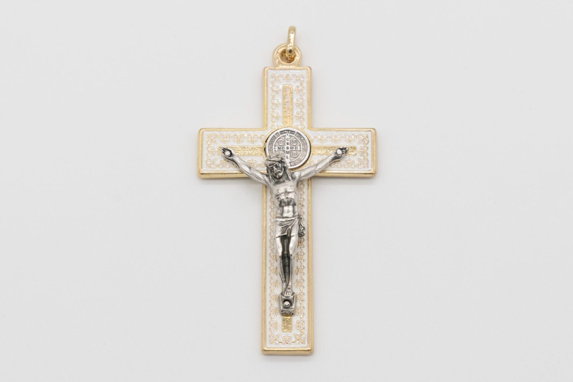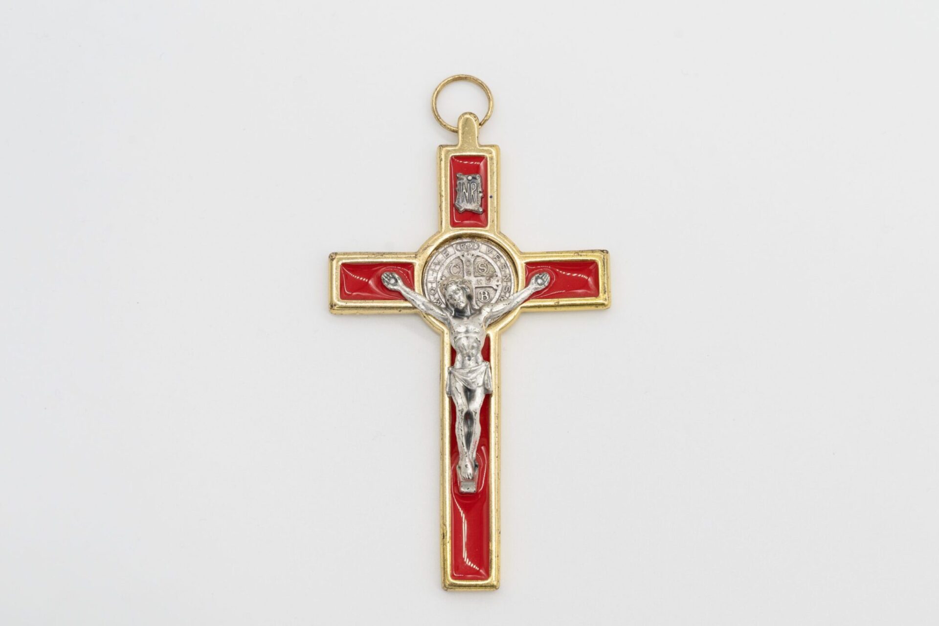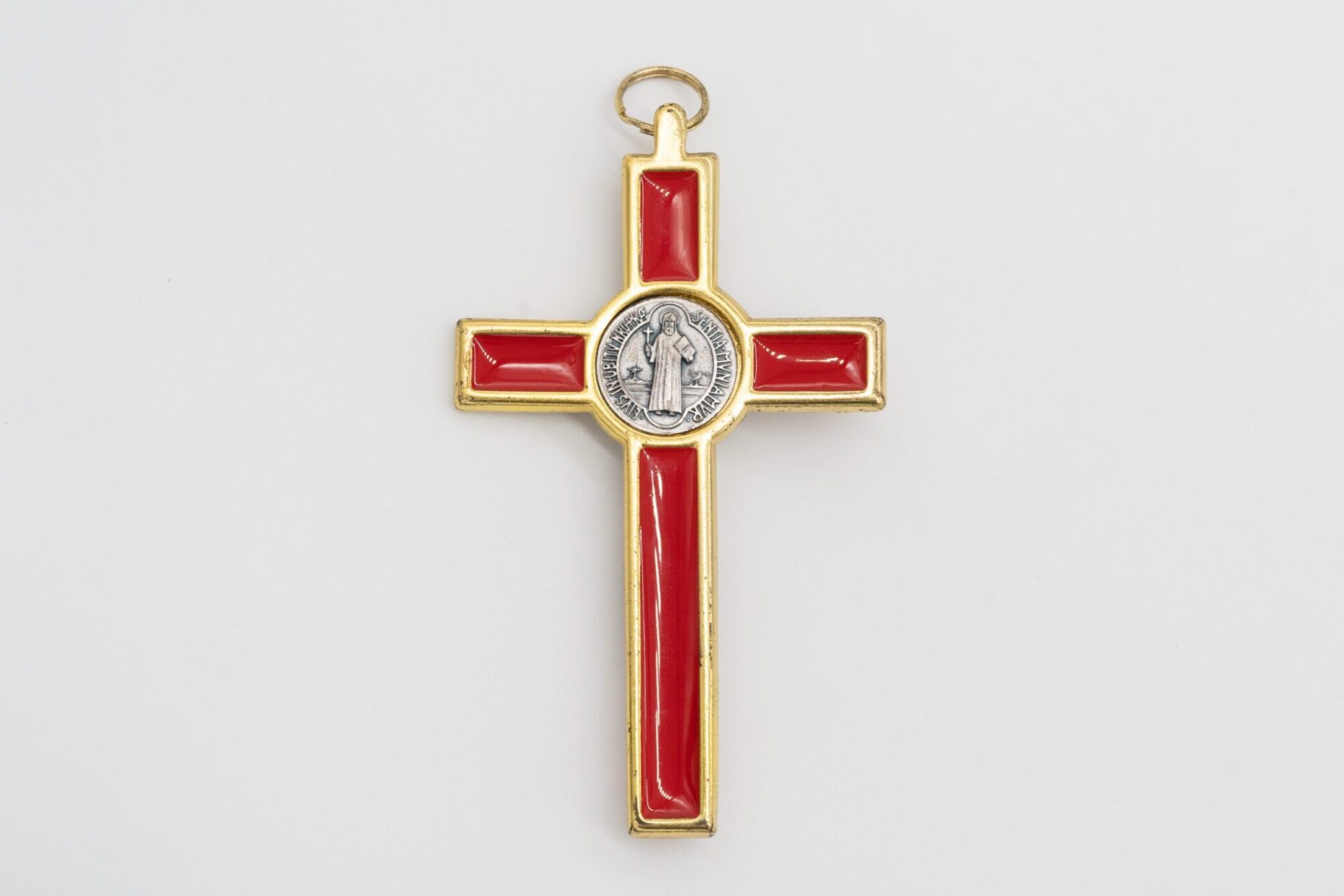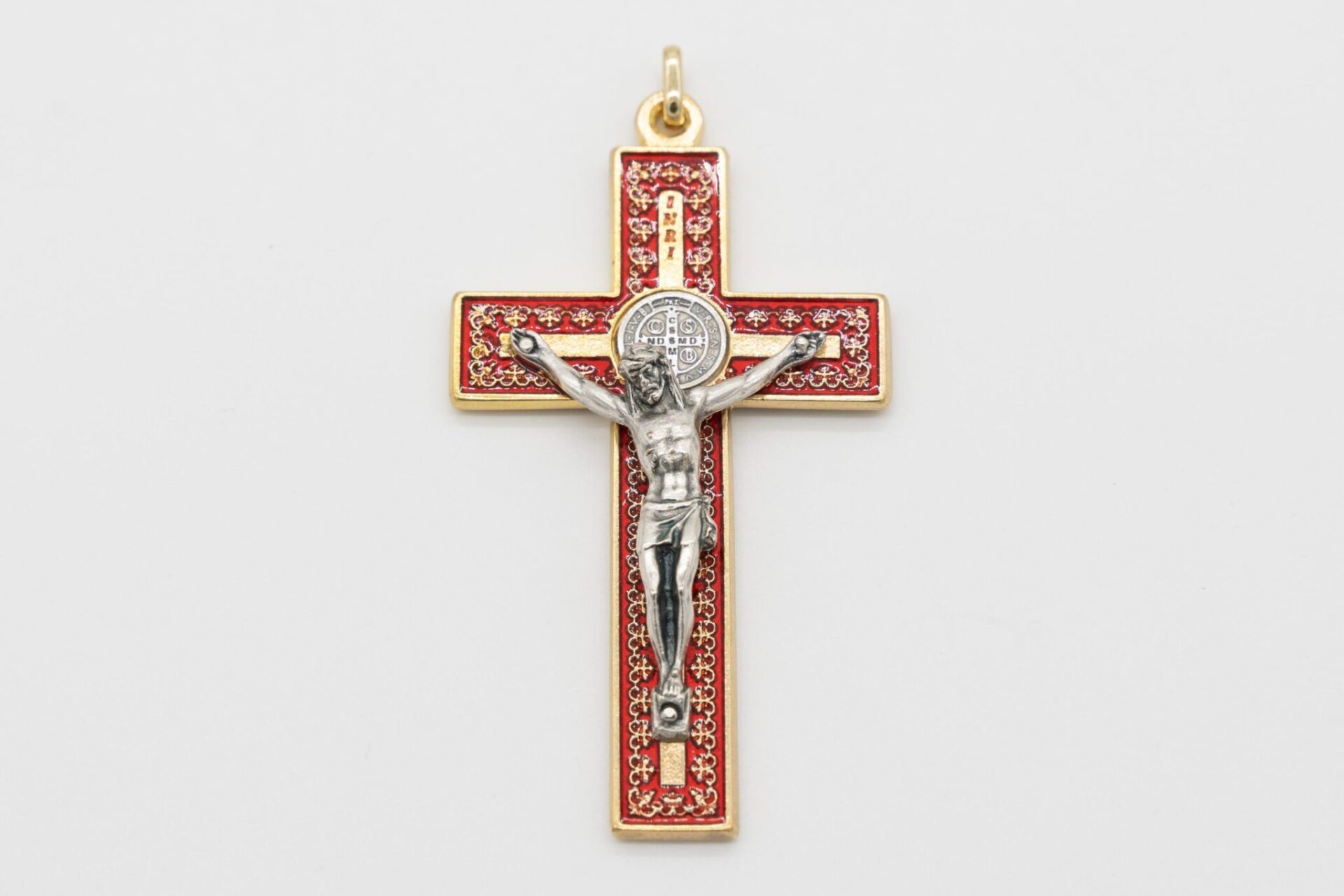 Crocifisso di San Benedetto in metallo color oro e smalto rosso lucido, con corpo di Cristo e medaglia del Santo in metallo argentato, finemente lavorato e curato nei dettagli. Essendo un prodotto artigianale, il colore del metallo può variare leggermente a seconda della brunitura.