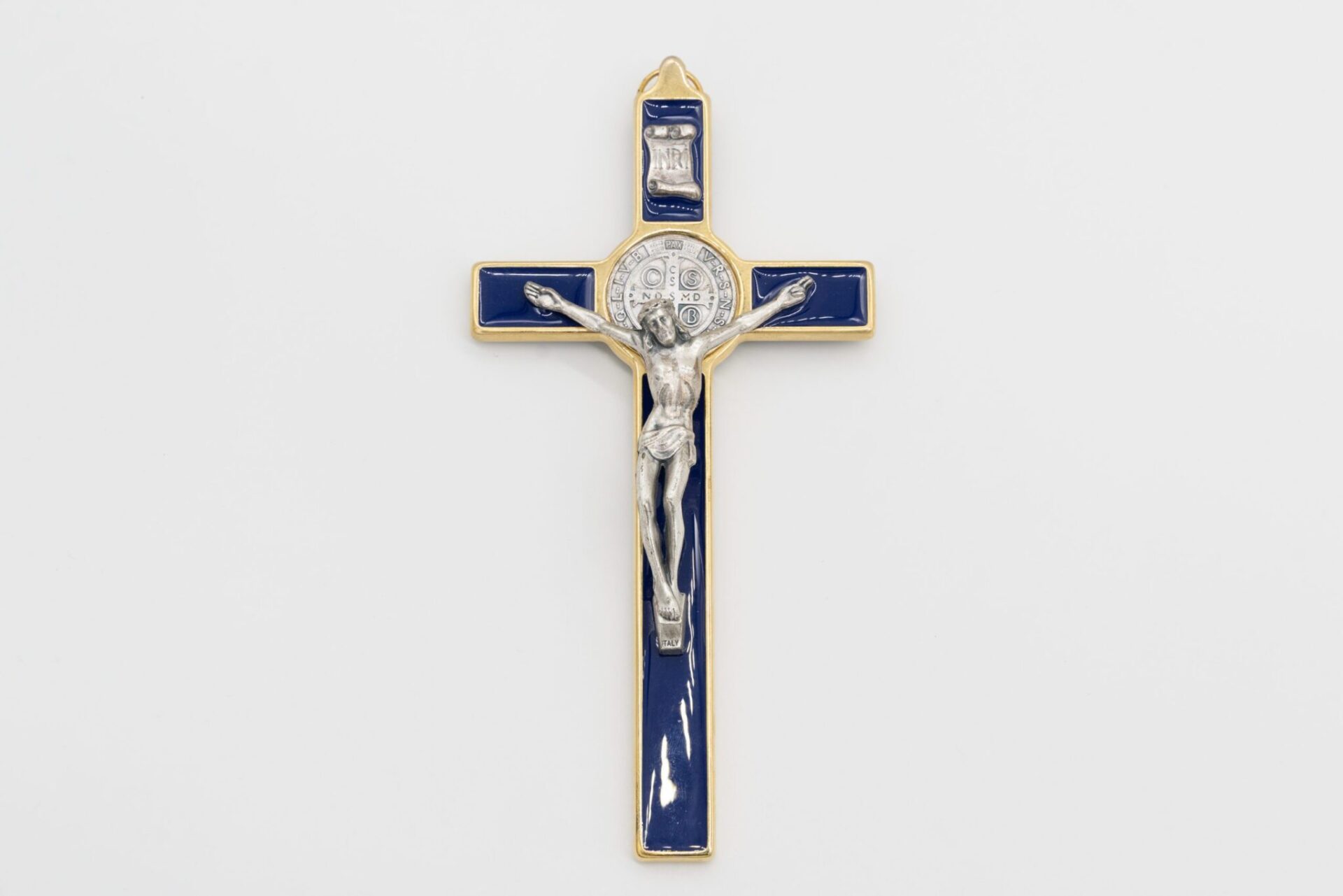 Crocifisso di San Benedetto in metallo color argento e smalto blu lucido/trasparente, con corpo di Cristo e medaglia del Santo in metallo argentato, finemente lavorato e curato nei dettagli. Essendo un prodotto artigianale, il colore del metallo o dello smalto può variare leggermente di intensità. Questo modello di crocifisso è distintivo perché presenta decorazioni di ispirazione araba all’interno.