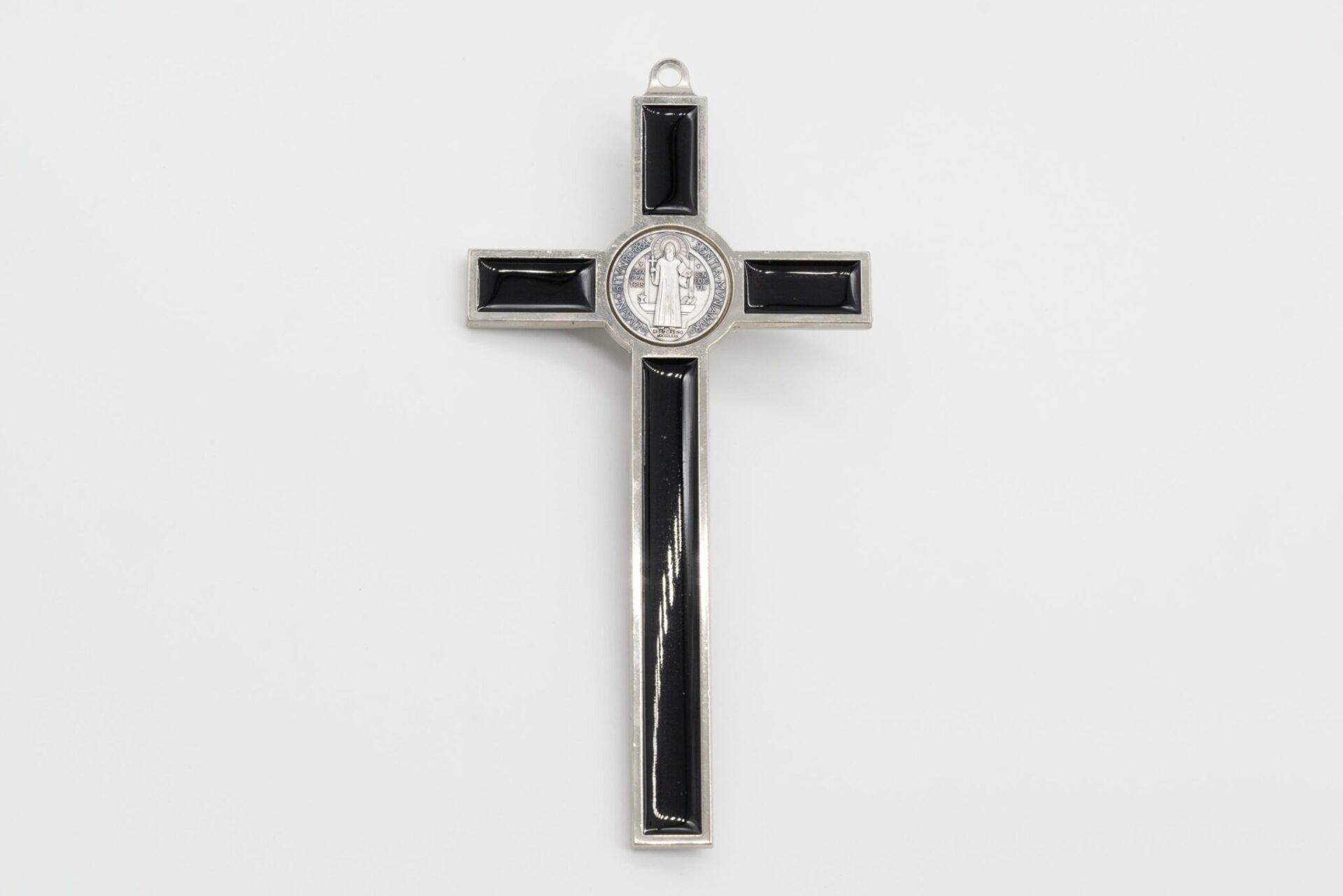Crocifisso di San Benedetto in metallo color argento e smalto nero lucido, con corpo di Cristo e medaglia del Santo in metallo argentato, finemente lavorato e curato nei dettagli. Essendo un prodotto artigianale, il colore del metallo può variare leggermente a seconda della brunitura.