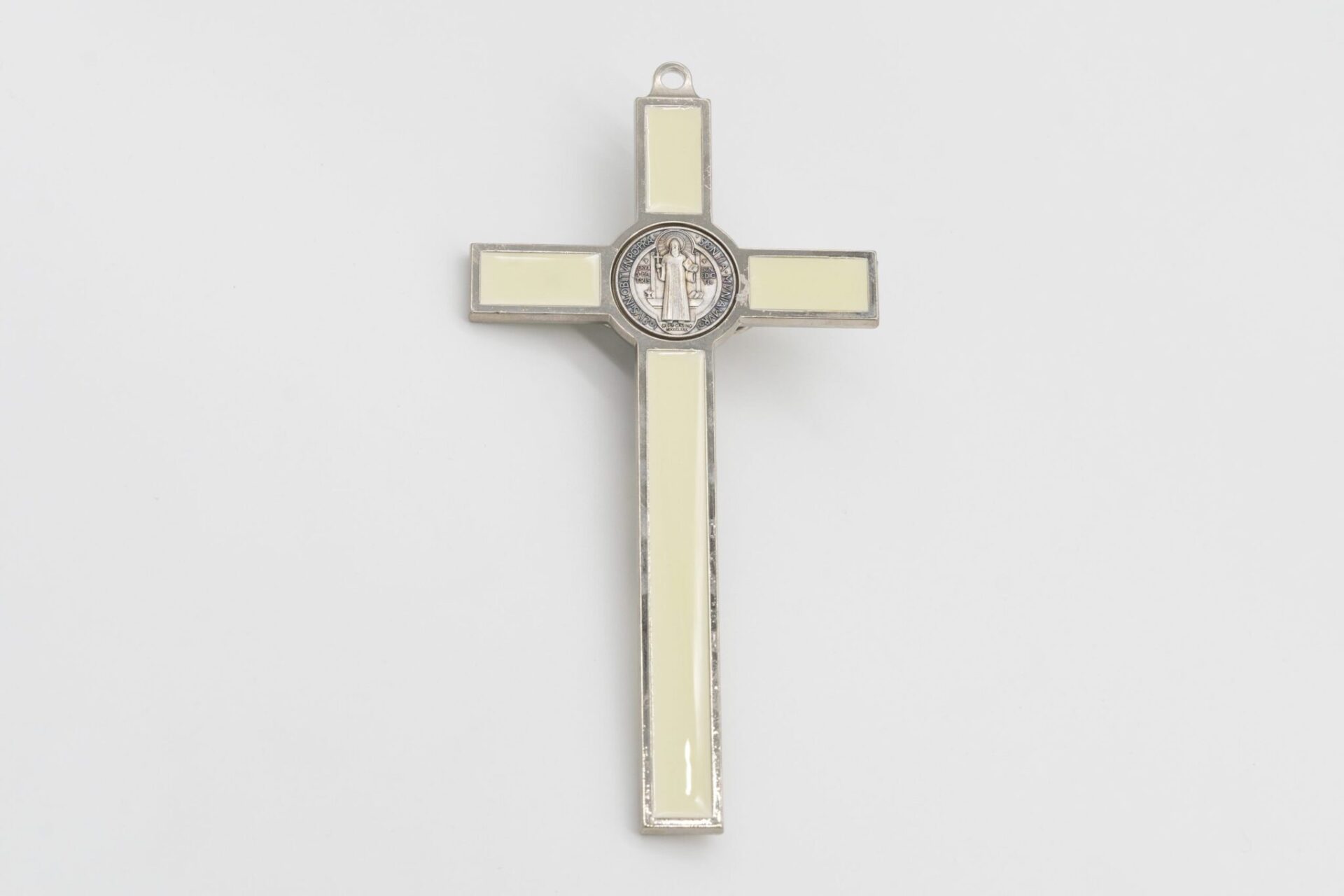 Crocifisso di San Benedetto in metallo color argento e smalto bianco fosforescente, con corpo di Cristo e medaglia del Santo in metallo argentato, finemente lavorato e curato nei dettagli. Essendo un prodotto artigianale, il colore del metallo può variare leggermente a seconda della brunitura. Questo crocifisso è caratteristico perché si illumina di notte grazie alla sua fluorescenza.