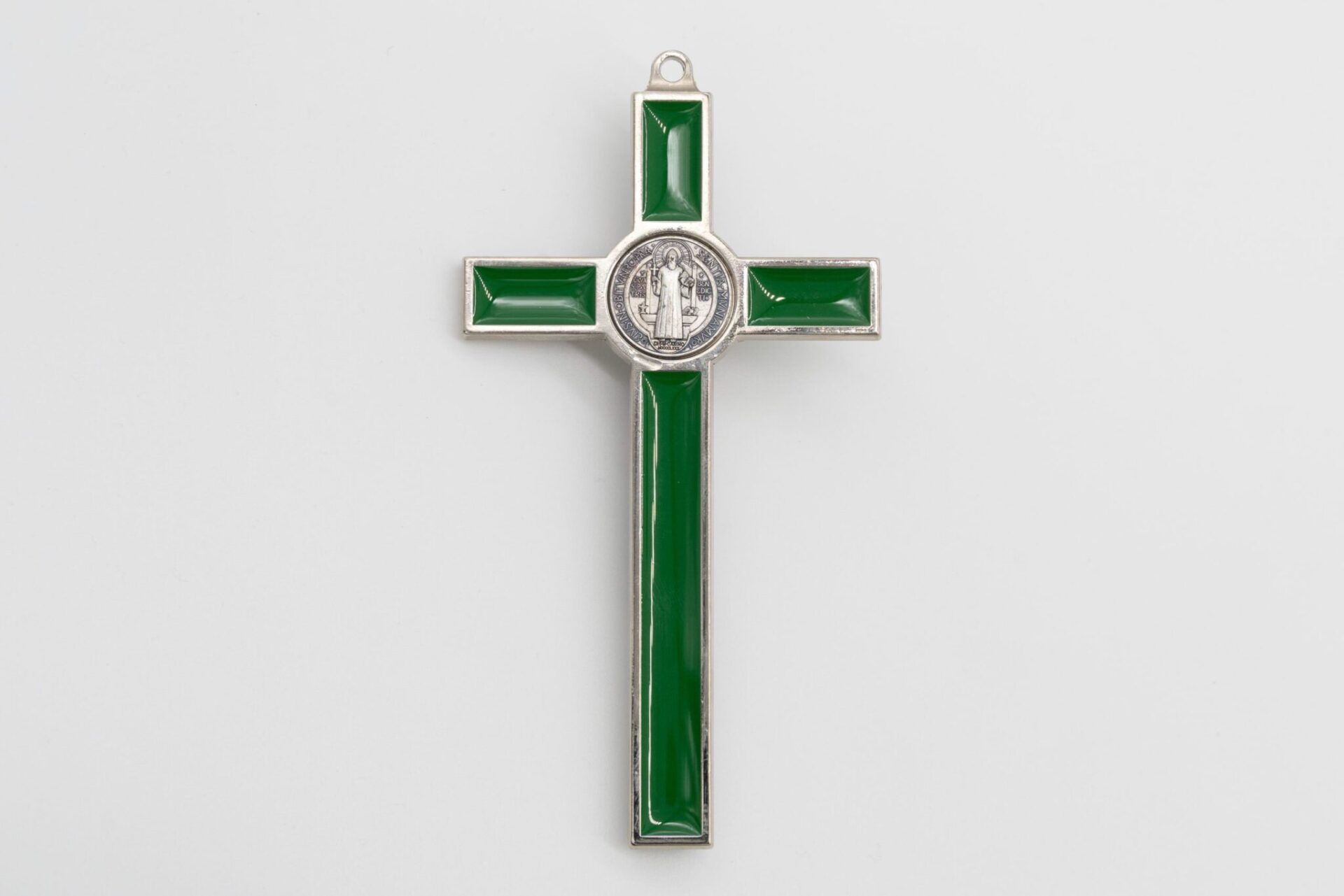 Crocifisso di San Benedetto in metallo color argento e smalto verde, con corpo di Cristo e medaglia del Santo in metallo argentato, finemente lavorato e curato nei dettagli. Essendo un prodotto artigianale, il colore del metallo o dello smalto può variare leggermente di intensità.