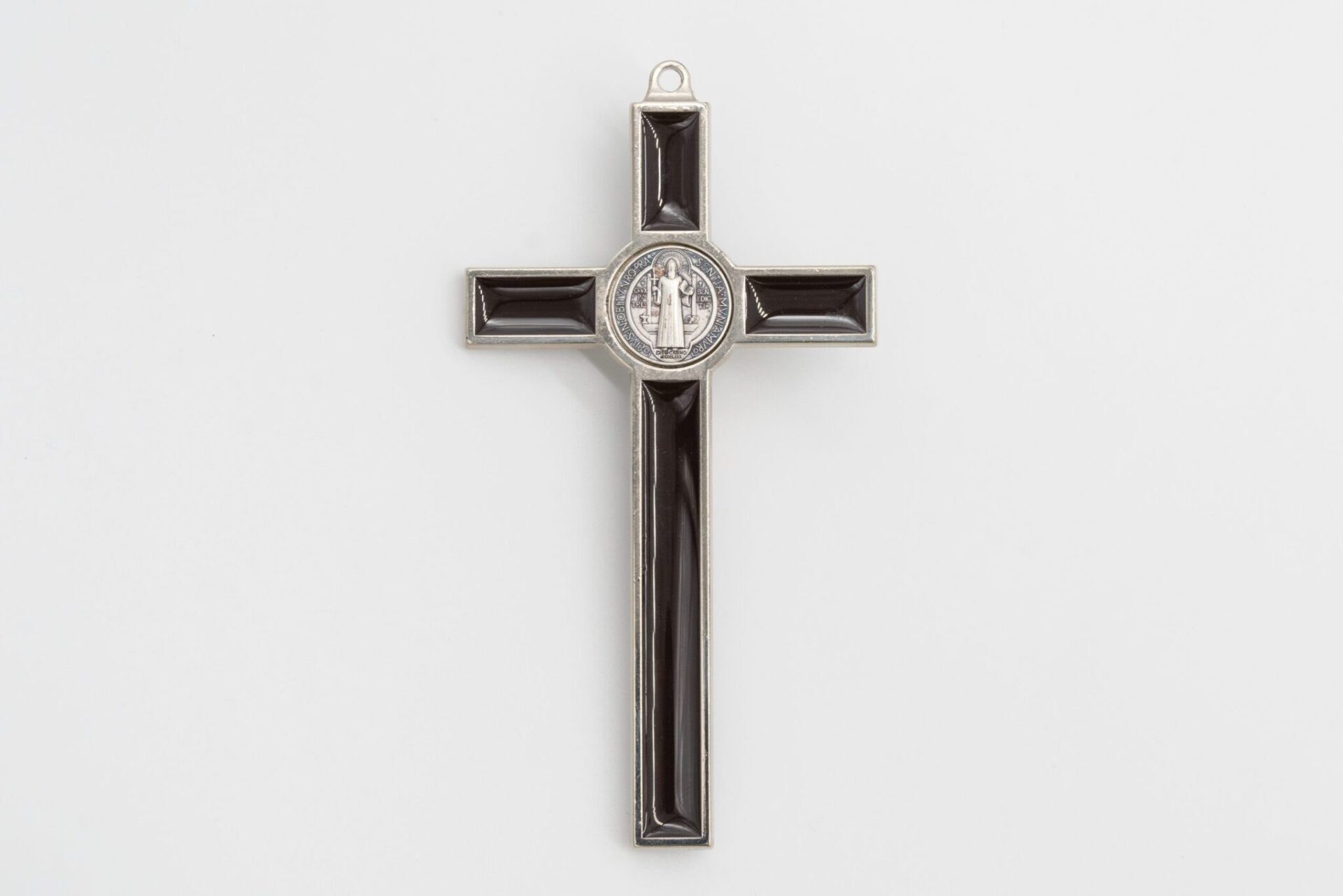Crocifisso San Benedetto in metallo color argento e smalto marrone cm 13