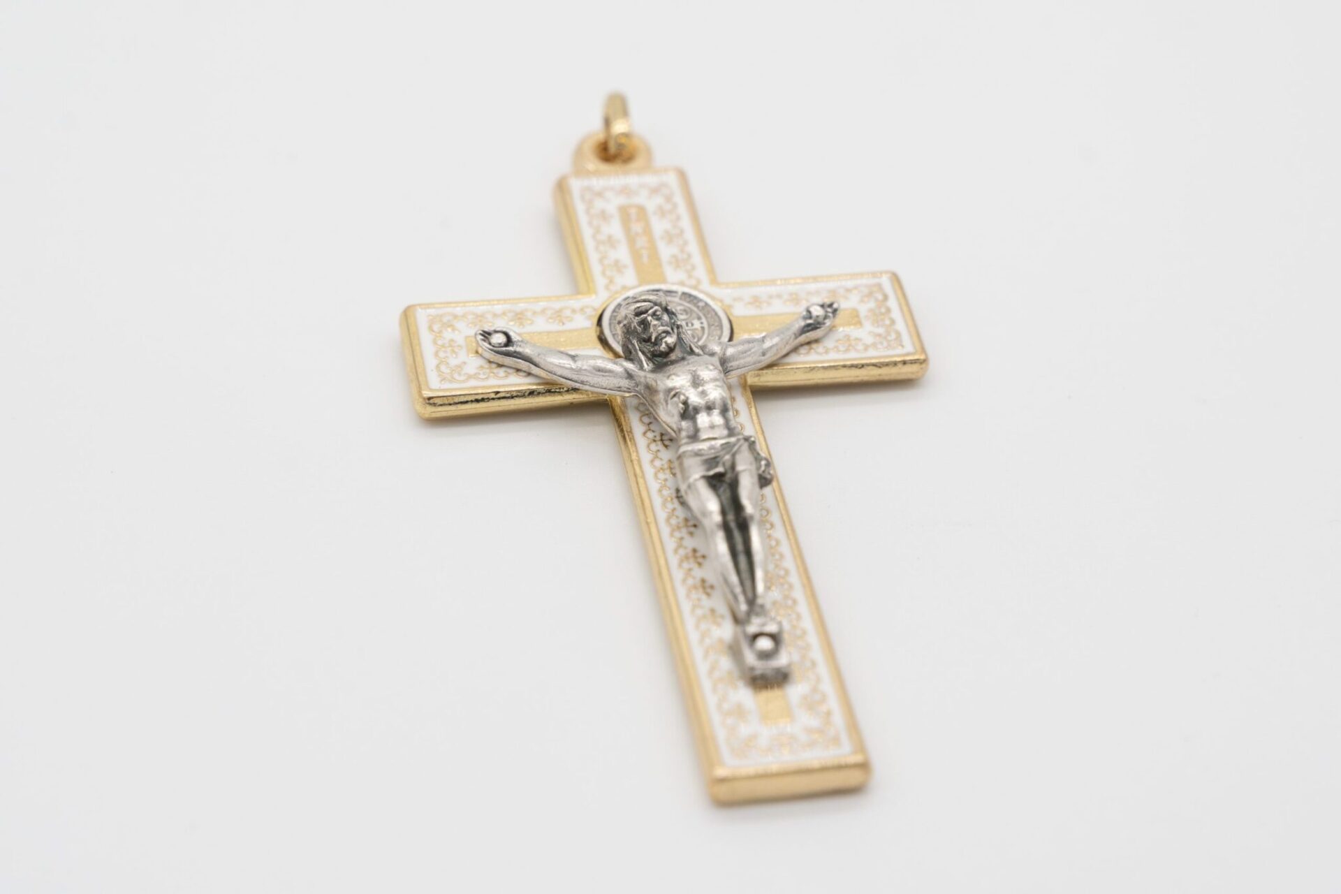 Crocifisso di San Benedetto in metallo color oro e smalto bianco lucido/trasparente, con corpo di Cristo e medaglia del Santo in metallo argentato, finemente lavorato e curato nei dettagli. Essendo un prodotto artigianale, il colore del metallo o dello smalto può variare leggermente di intensità. Questo modello di crocifisso è distintivo perché presenta decorazioni di ispirazione araba all’interno.