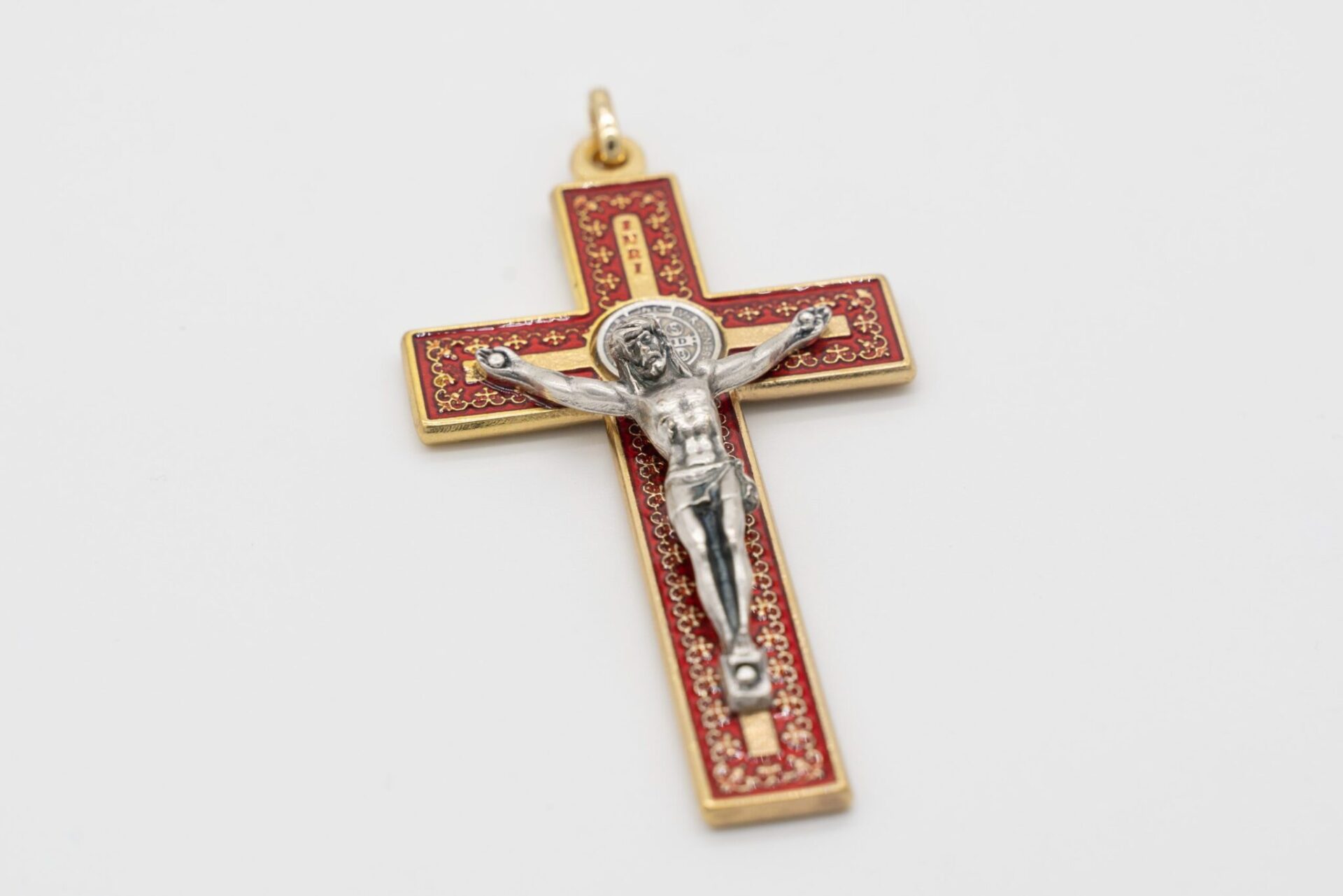 Crocifisso di San Benedetto in metallo color oro e smalto rosso lucido/trasparente, con corpo di Cristo e medaglia del Santo in metallo argentato, finemente lavorato e curato nei dettagli. Essendo un prodotto artigianale, il colore del metallo o dello smalto può variare leggermente di intensità. Questo modello di crocifisso è distintivo perché presenta decorazioni di ispirazione araba all’interno.