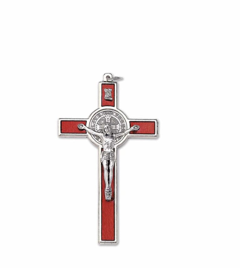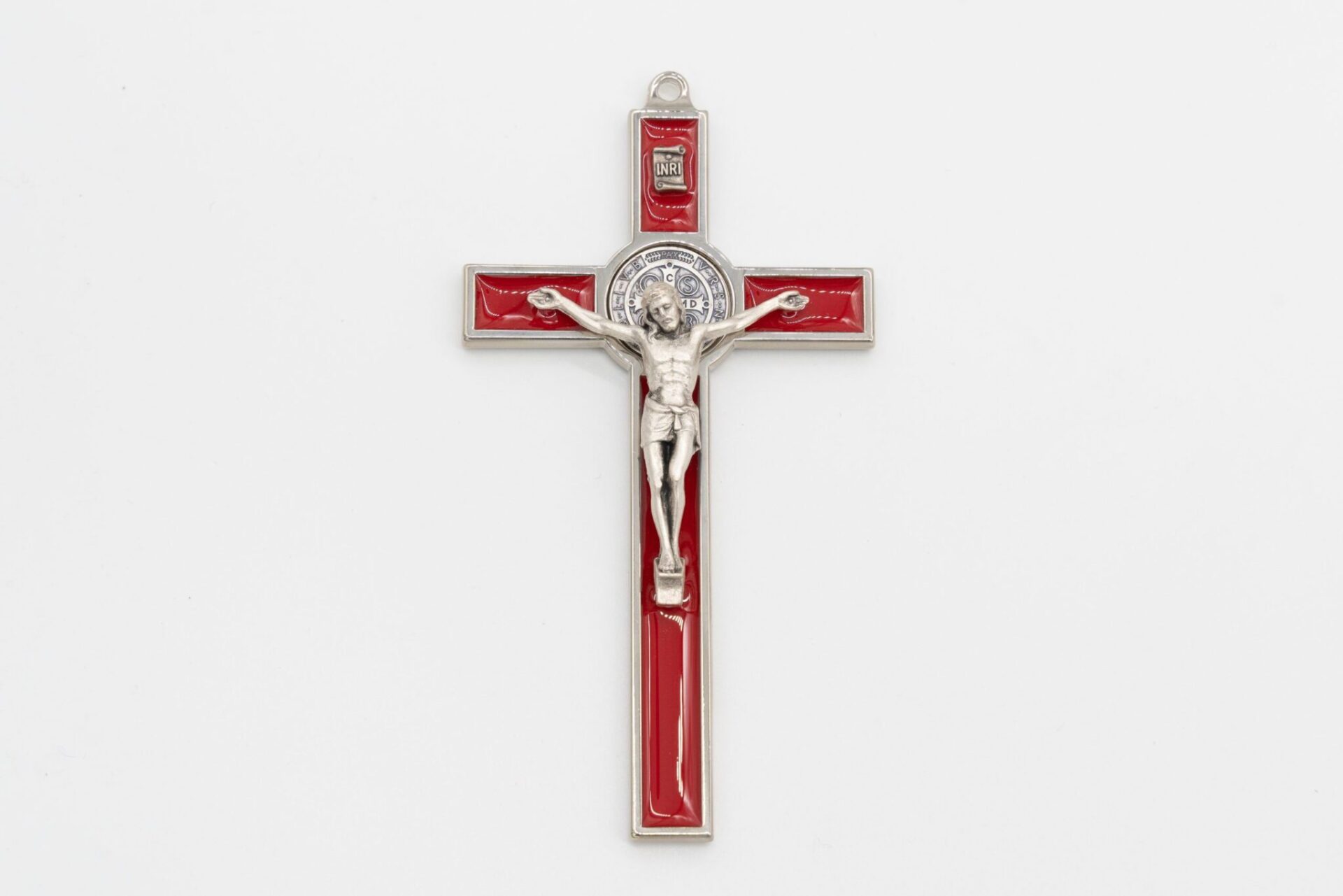 Crocifisso di “San Benedetto” in metallo color argento e smalto rosso lucido/trasparente, con corpo di Cristo e medaglia del Santo in metallo argentato, finemente lavorato e curato nei dettagli. Essendo un prodotto artigianale, il colore del metallo o dello smalto può variare leggermente di intensità.