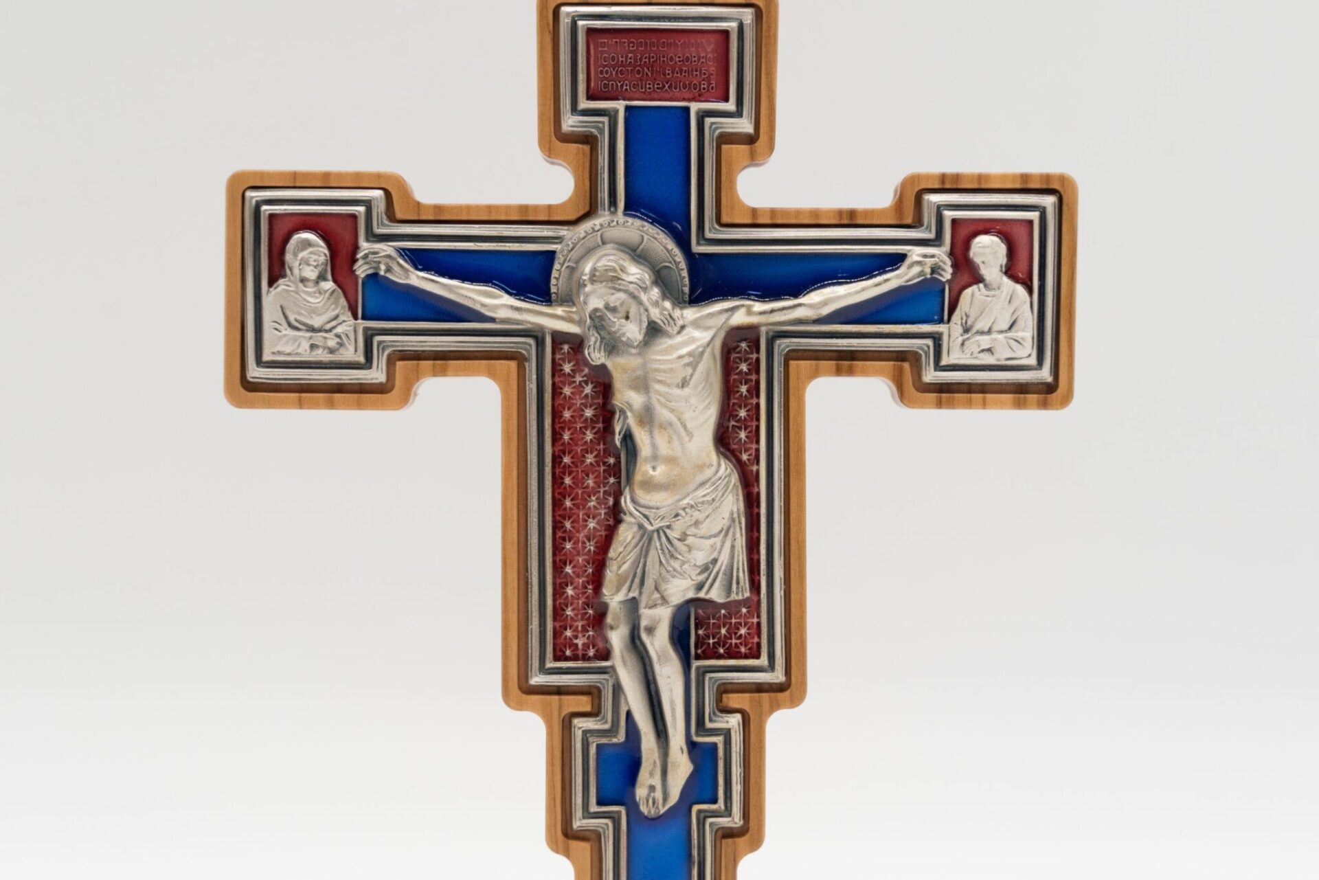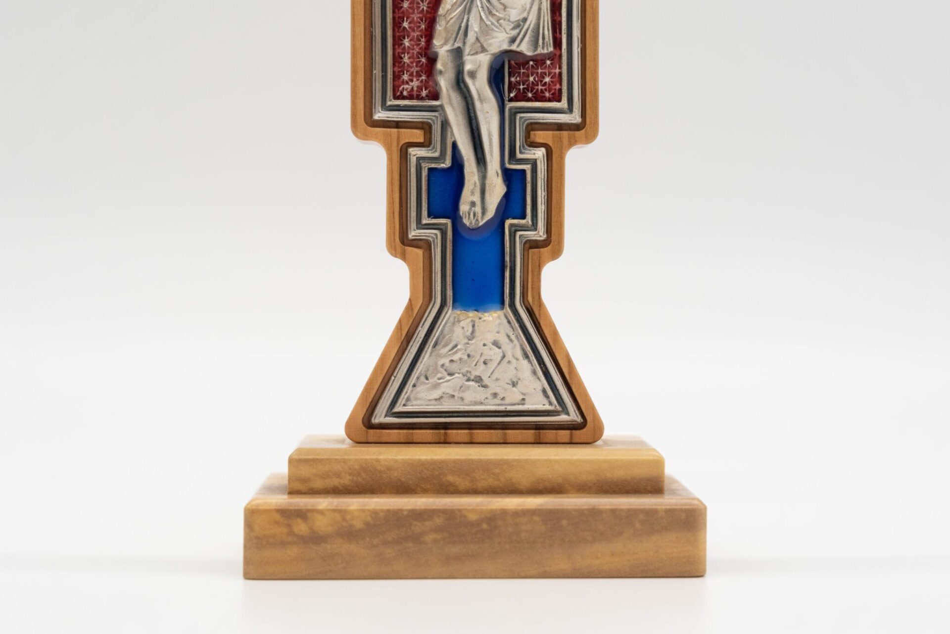 Il crocifisso è caratterizzato da una palette di colori intensi, con l’uso predominante di argento, rosso e blu;